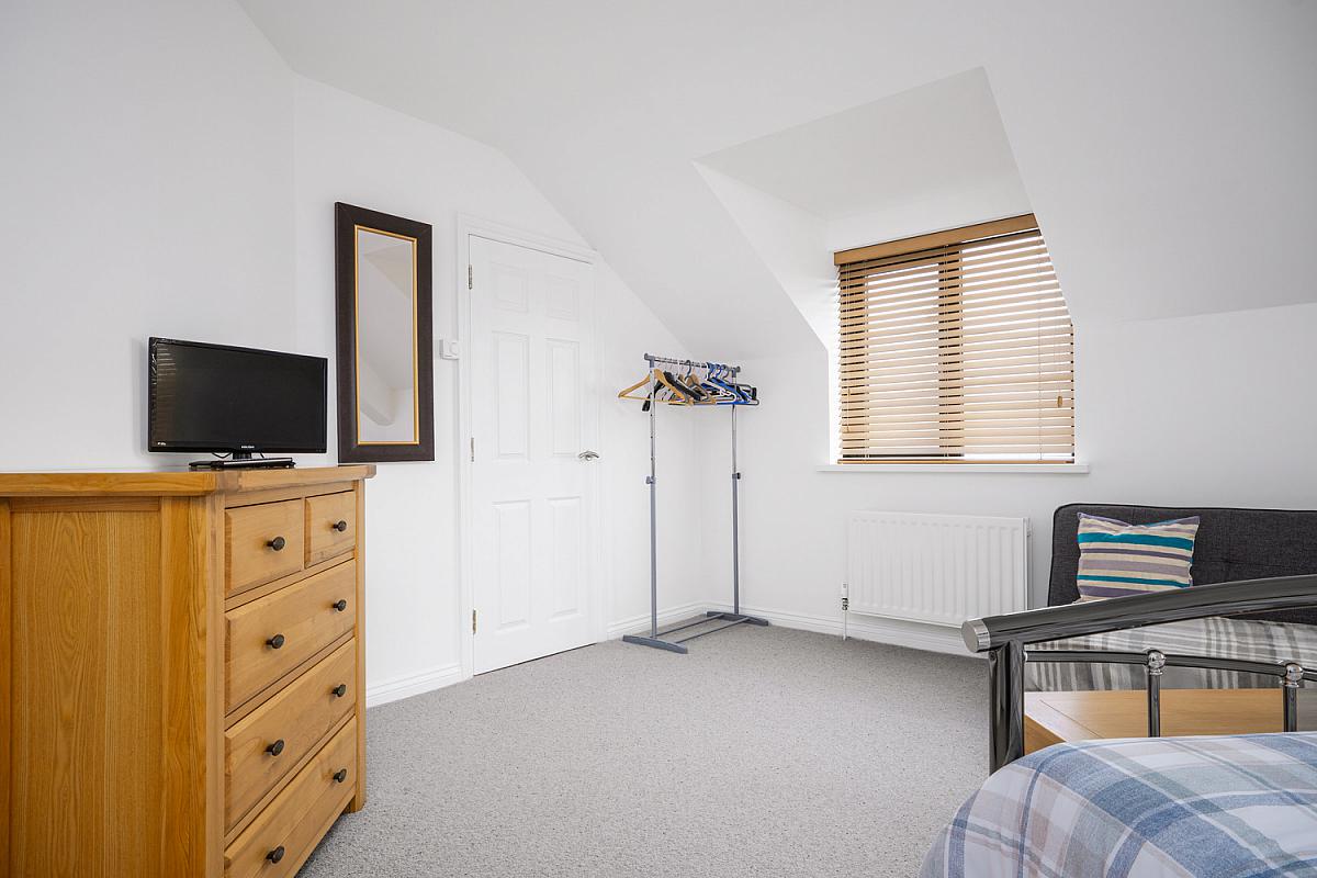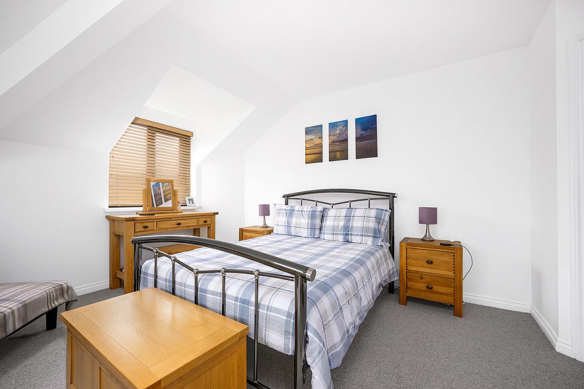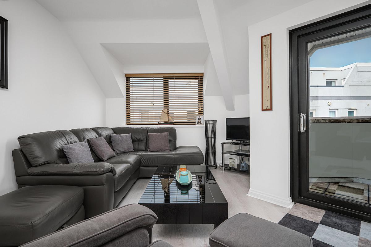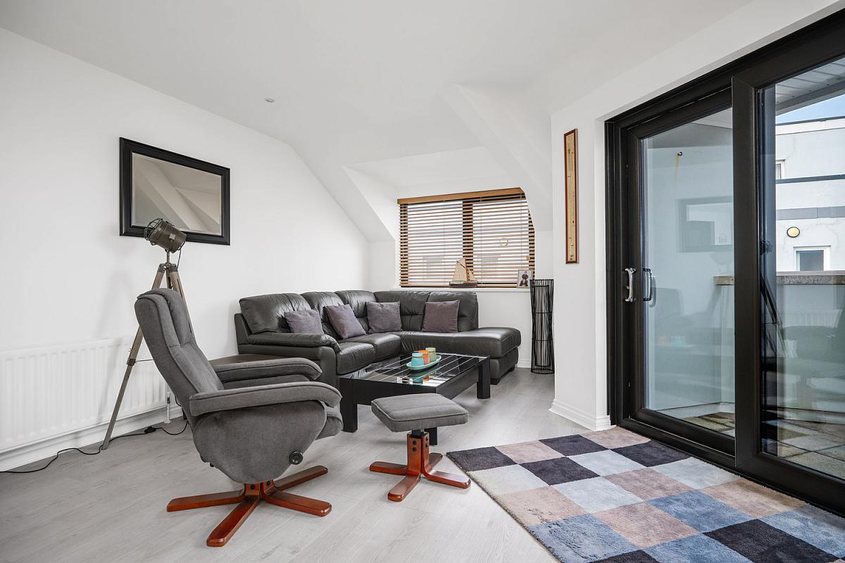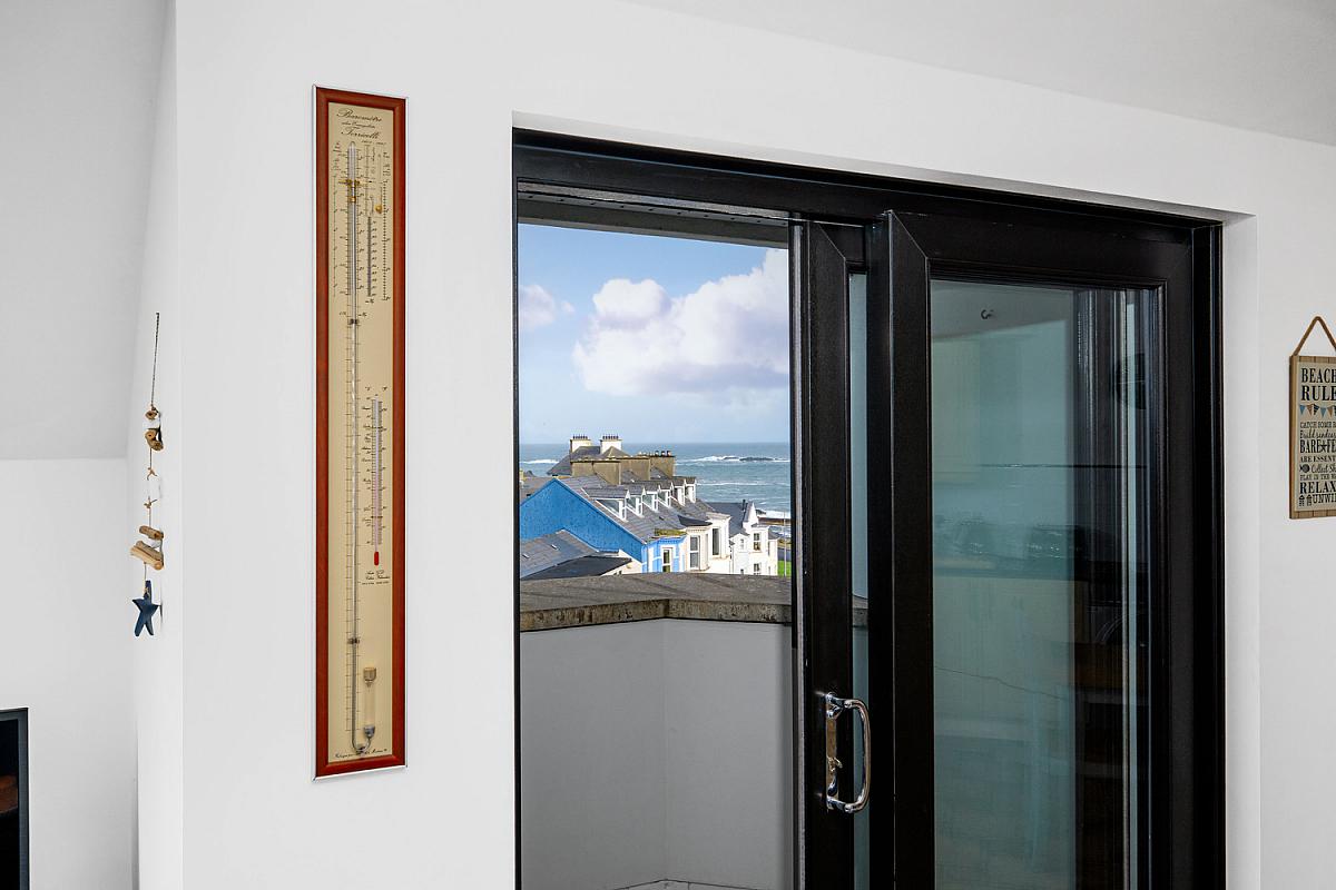 With recessed lighting, laminate wood floor and PVC sliding doors leading to balcony with views across Atlantic Ocean and Skerries Islands.