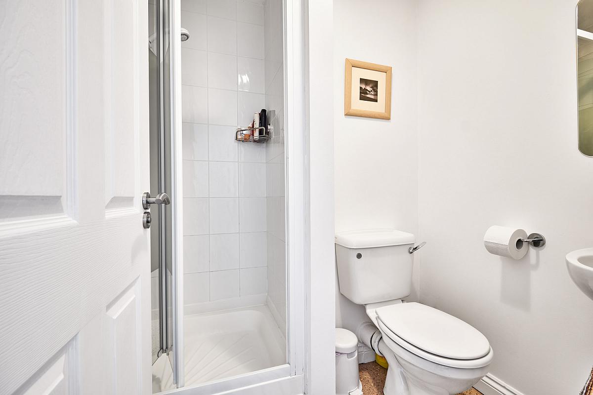 off with w.c., wash hand basin with tiled splashback, fully tiled walk in shower cubicle with electric shower, and extractor fan.