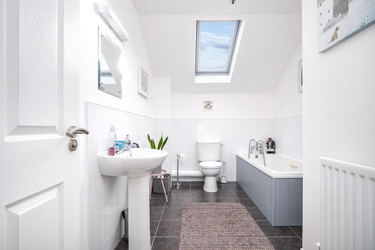 With white suite comprising w.c., wash han basin with tiled splashback, bath with tiled surround, extractor fan and recessed lighting.