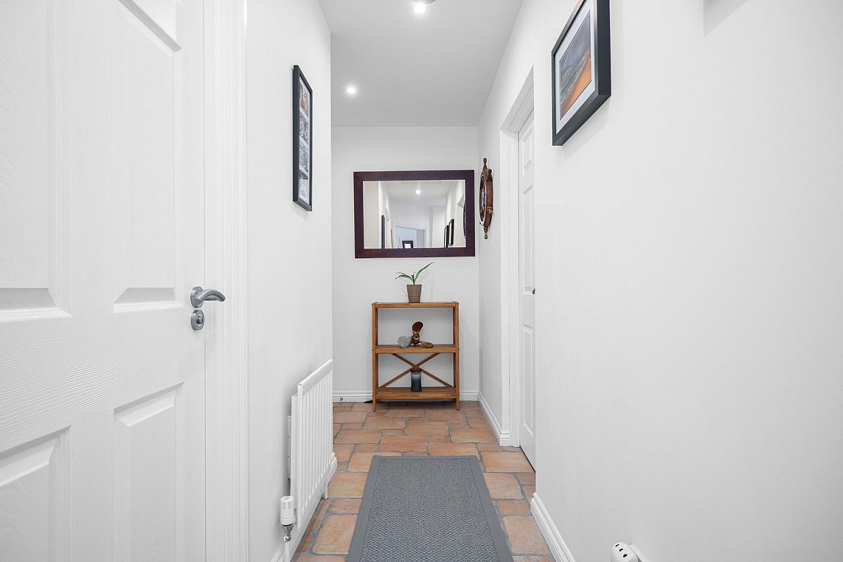 With cloaks cupboard, recessed lighting, access to roof space and tiled floor.