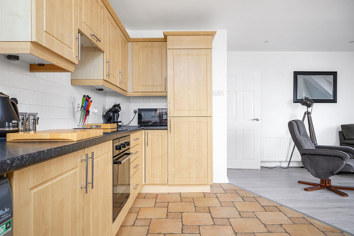 With single drainer stainless steel sink unit, high and low level built in units with tiling between, integrated ceramic hob, integrated oven and fridge freezer, tiled splashback, integrated washing machine, saucepan drawers, recessed lighting and tiled floor.