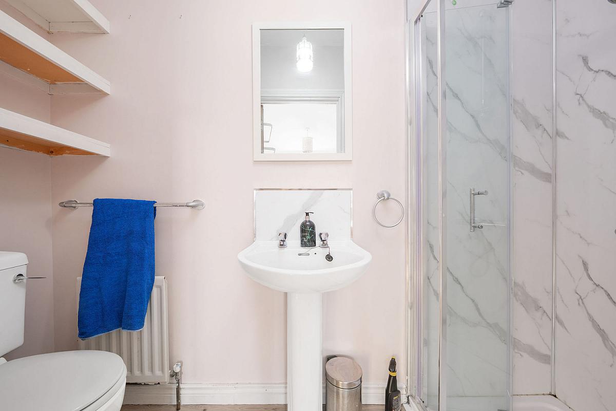 Ensuite off with w.c., wash hand basin with PVC splashback, fully PVC cladded walk in shower cubicle with mains shower, shelving and laminate wood floor.