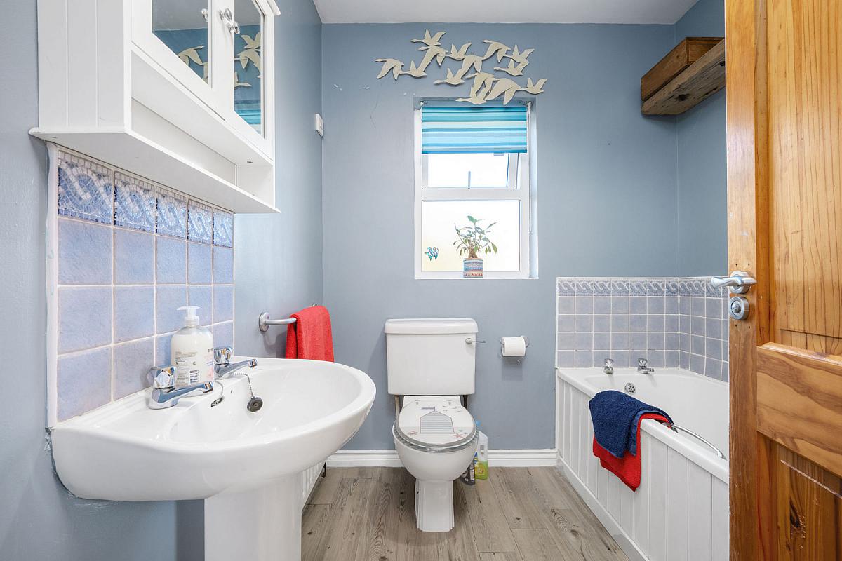 With white suite comprising w.c., wash hand basin with tiled splashback, bath with tiled surround, extractor fan and laminate wood floor.