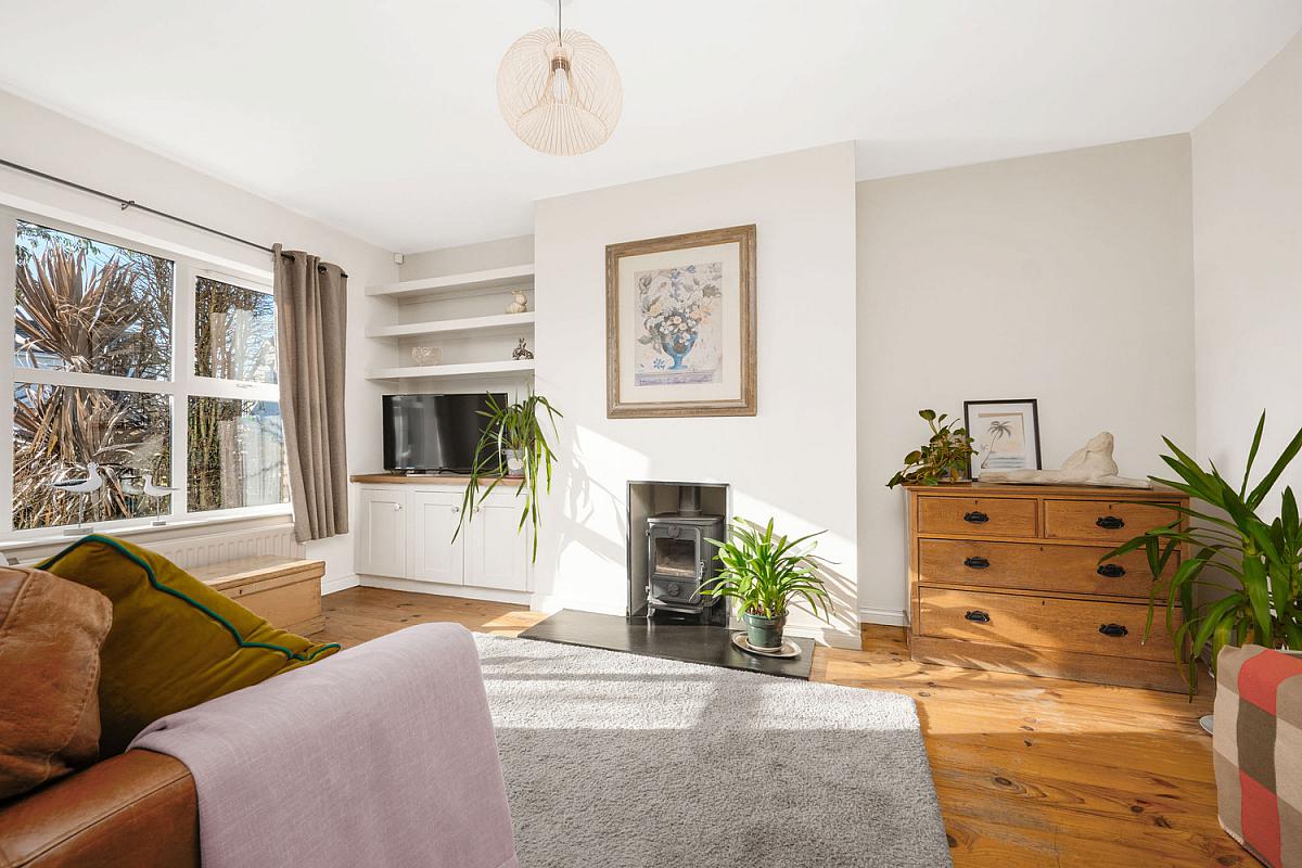 With recessed Morso multi fuel stove with slate hearth (recently supplied and fitted by Wilsons Coleraine), shelving and solid wood floor. 158 x 111