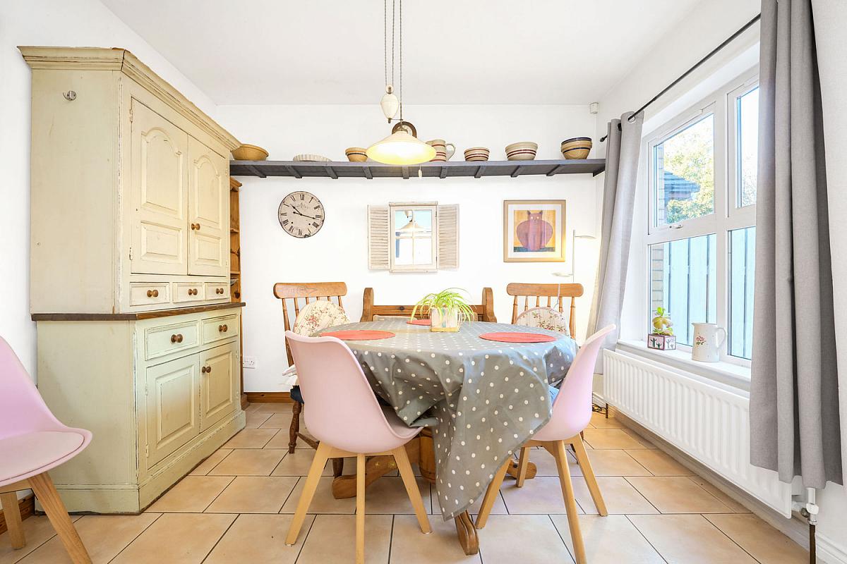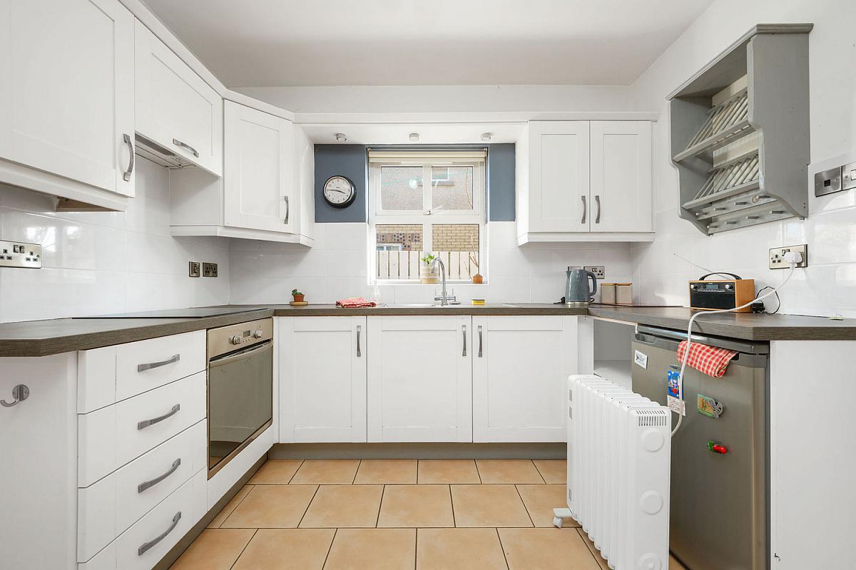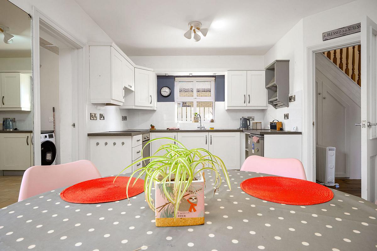 With single drainer stainless steel sink unit, high and low level built in units with tiling between, plumbed for automatic washing machine, space for tumble dryer, tiled floor and pedestrian door leading to rear garden. 7'9 x 5'6