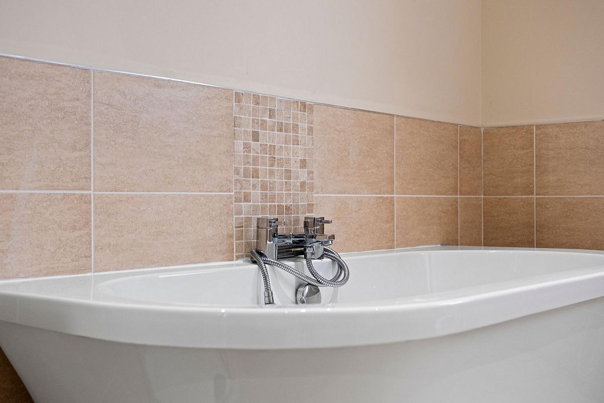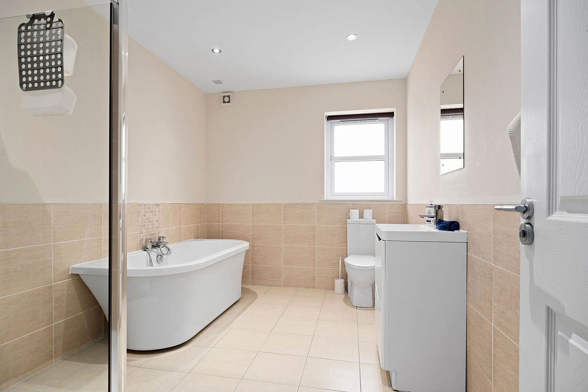 With white suite comprising w.c., wash hand basin with storage below, fully tiled walk in shower cubicle with mains rainfall shower head, additional telephone hand shower, telephone hand shower over bath, half tiled walls, heated towel rail, recessed lighting, extractor fan and tiled floor.