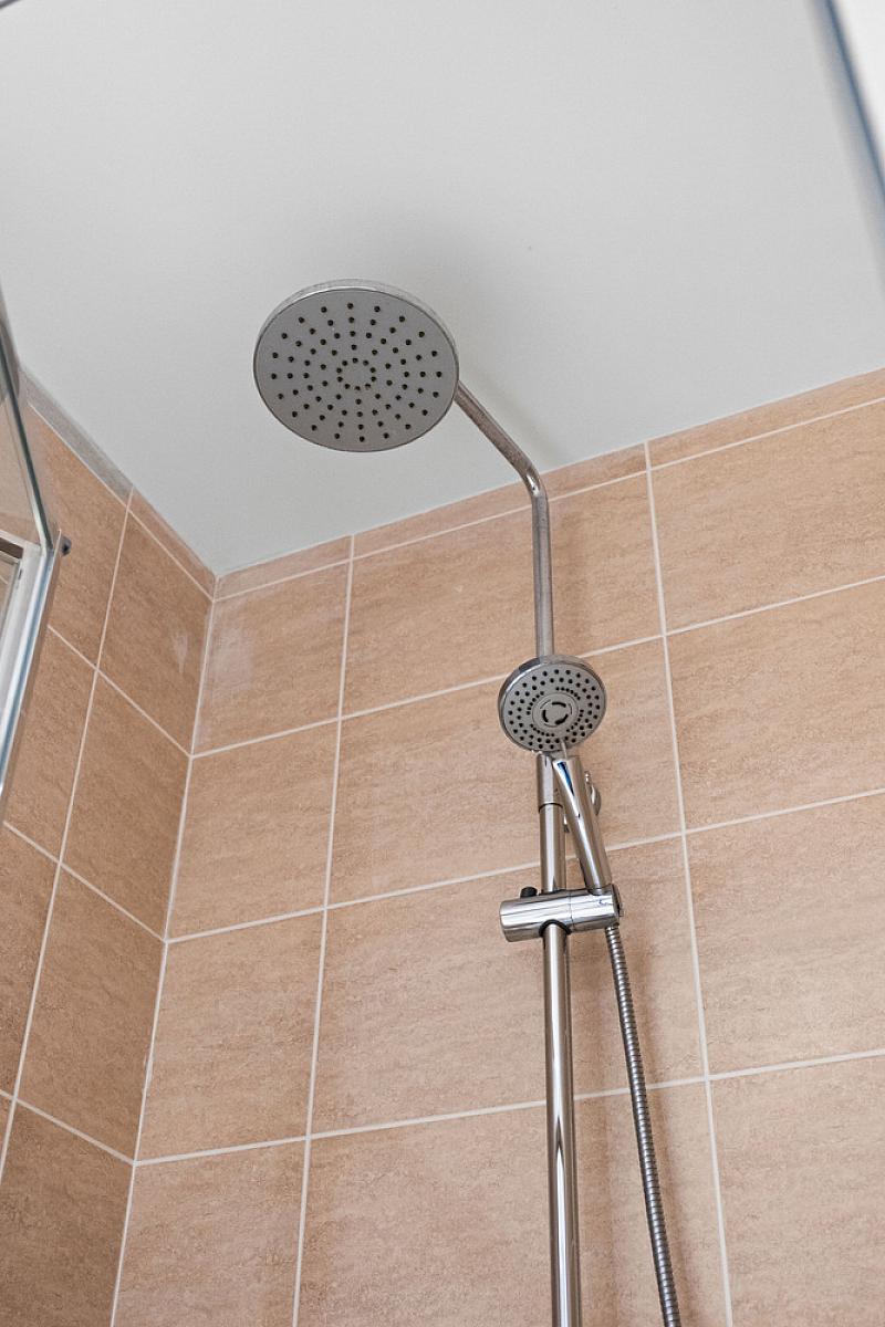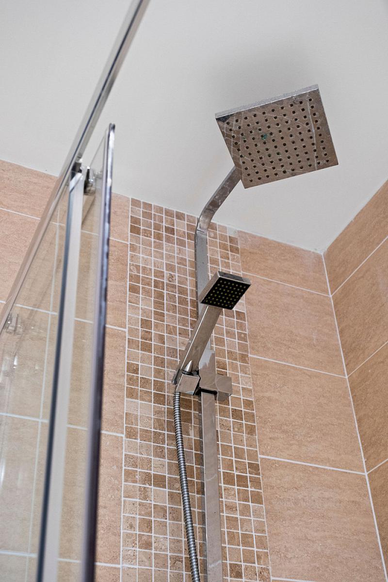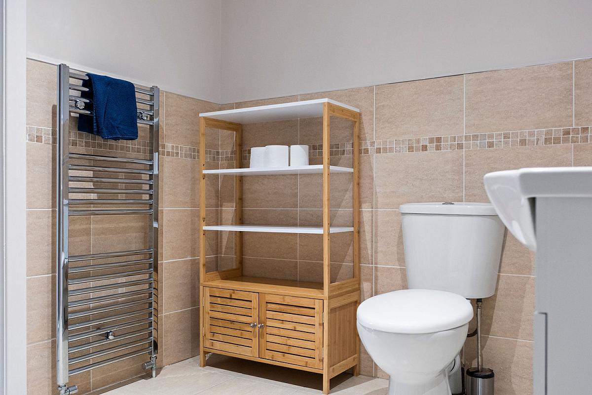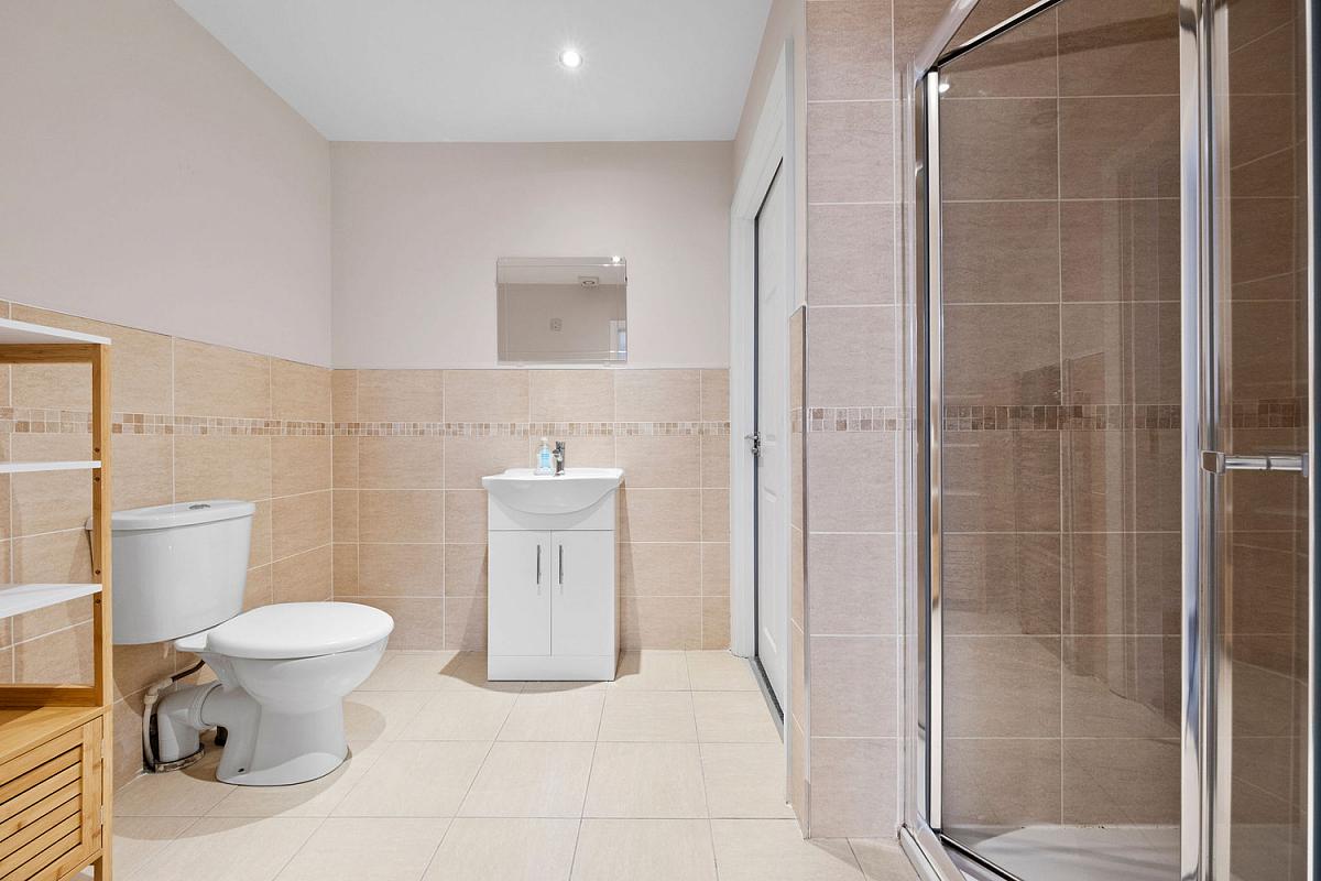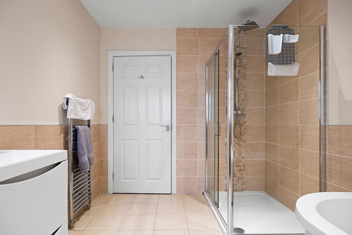 Off with w.c., wash hand basin with storage below, fully tiled walk in shower cubicle with mains rainfall shower head, additional telephone hand shower, heated towel rail, half tiled walls, recessed lighting, extractor fan and tiled floor.