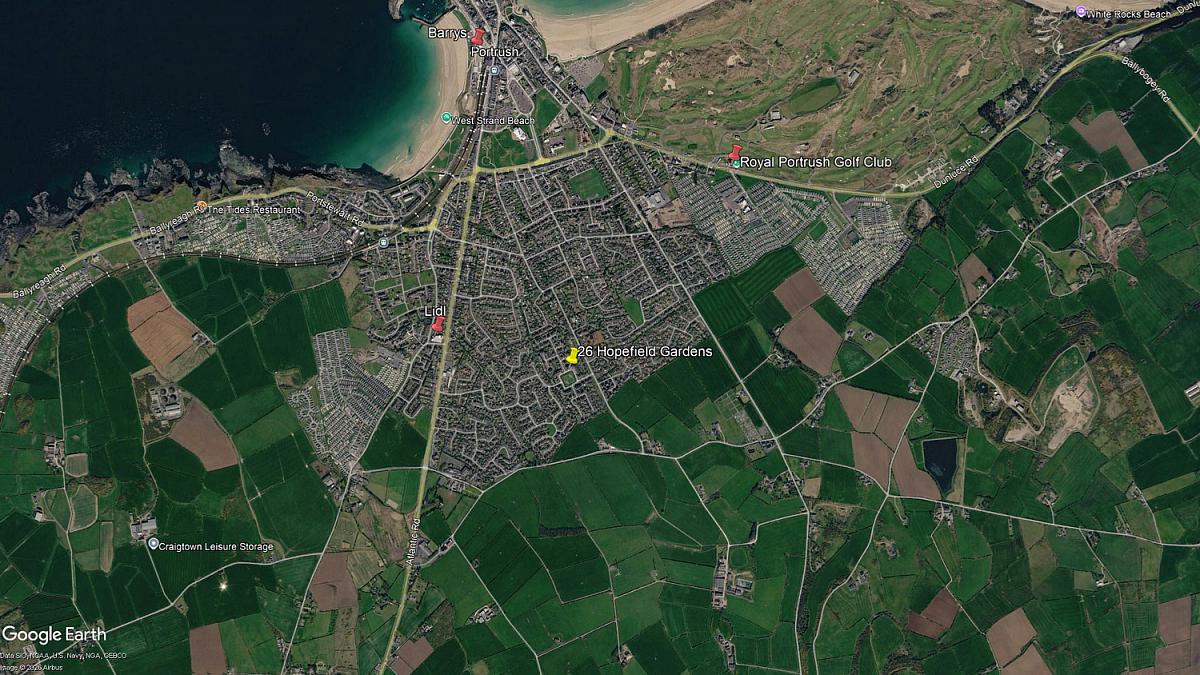 Travelling along the Hopefield Road in Portrush, proceed to the top of the road and take the last right into the Hopefield Development. No 26 Hopefield Gardens will be located on your right hand side overlooking the open green area.