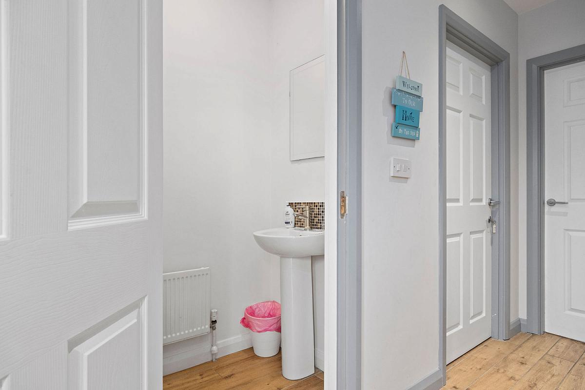 With wash hand basin with tiled splashback, extractor fan and tiled floor.