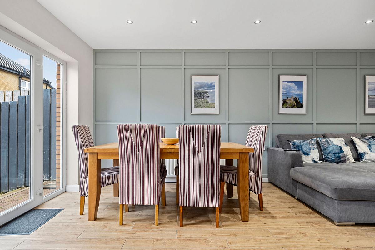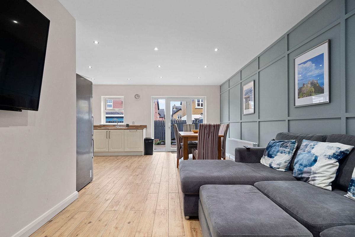 With single drainer stainless steel sink unit, high and low level built in units, integrated ceramic hob, integrated oven, extractor fan above, glass splashback, integrated dishwasher, space for fridge freezer, part panelled walls, recessed lighting, tiled floor and PVC pedestrian door leading to rear garden.