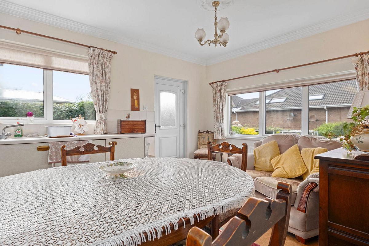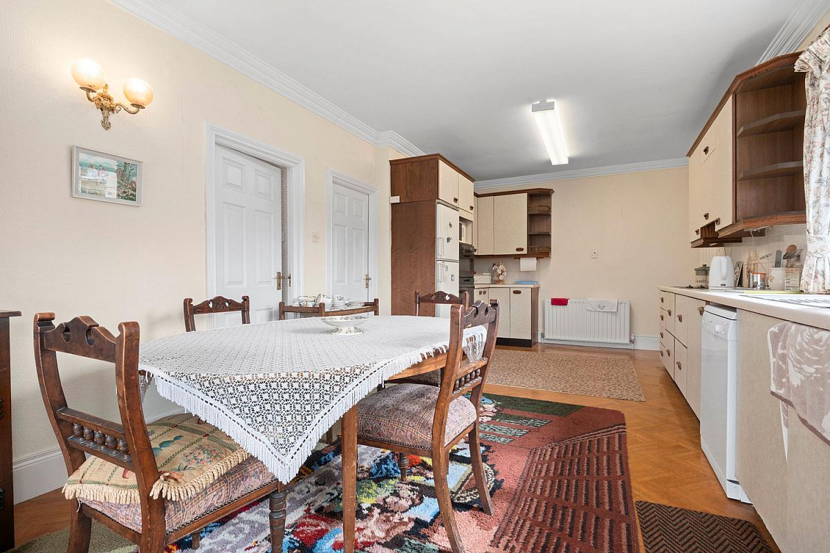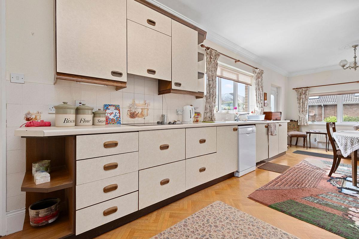 With single drainer stainless steel sink unit, high and low level built in units with tiling between, integrated double eye level oven, ceramic hob and extractor fan above, space for fridge freezer, plumbed for automatic dishwasher, saucepan drawers, drawer bank, corner shelving, cornicing, centrepiece, strip lighting, wired for wall lights and PVC pedestrian door leading to rear garden and door into integral garage.