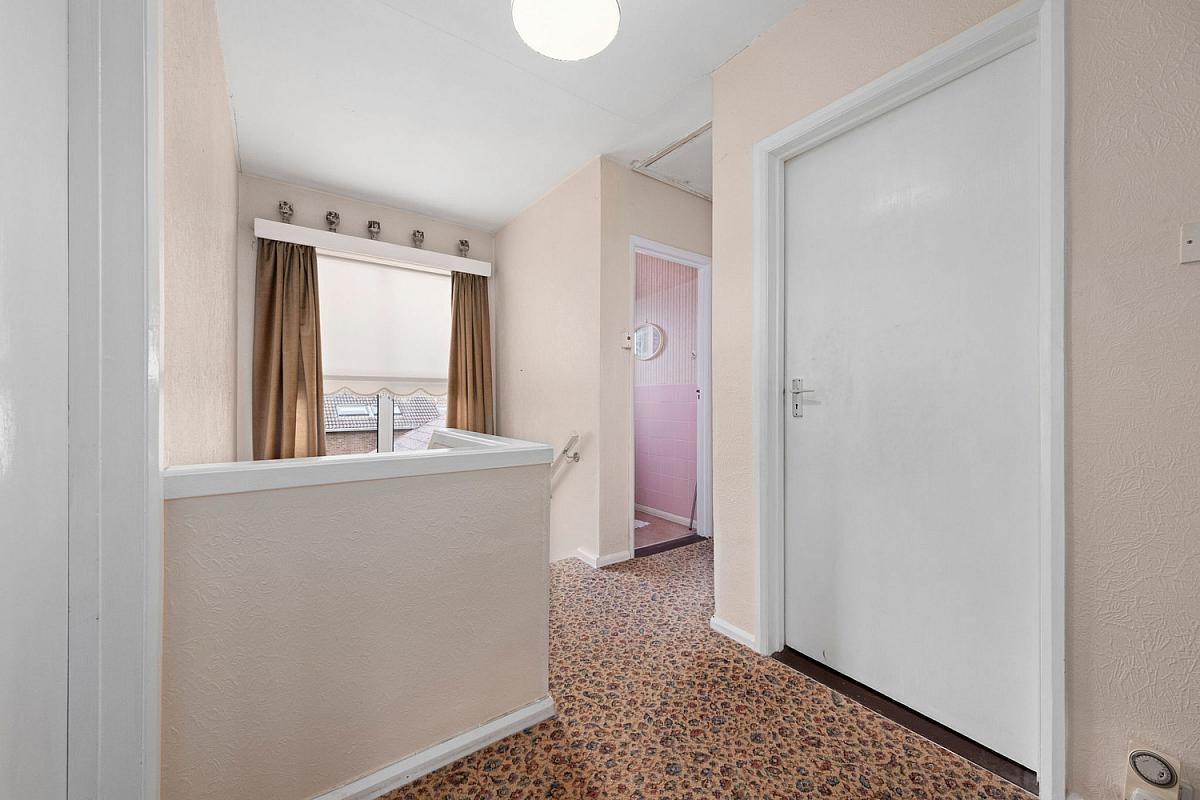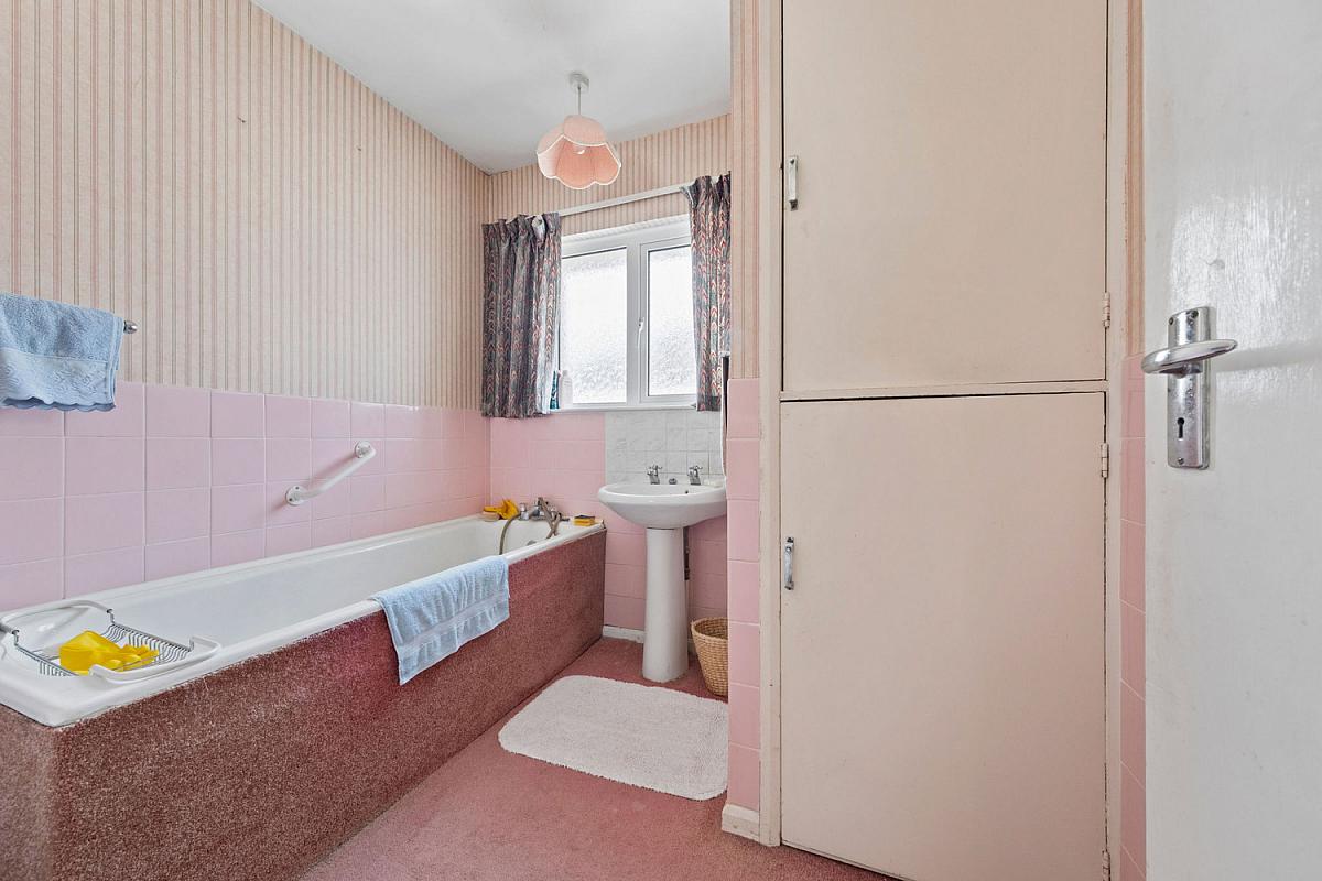 With white suite comprising w.c., wash hand basin, telephone hand shower over bath, hot press and half tiled walls.