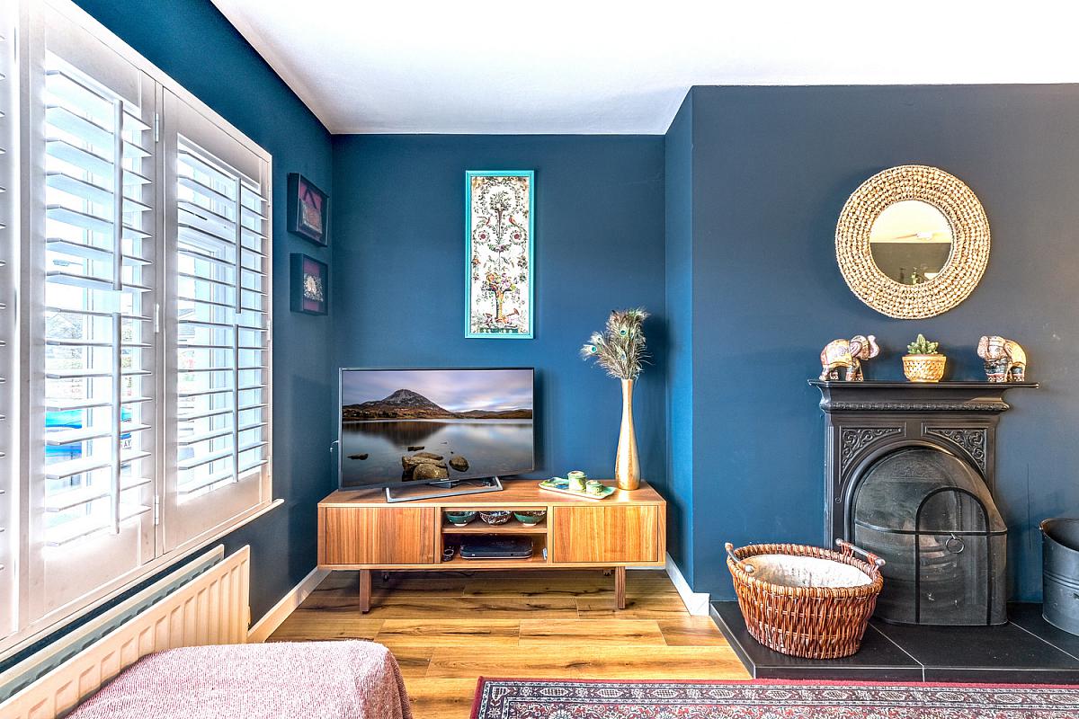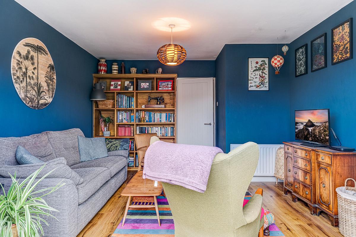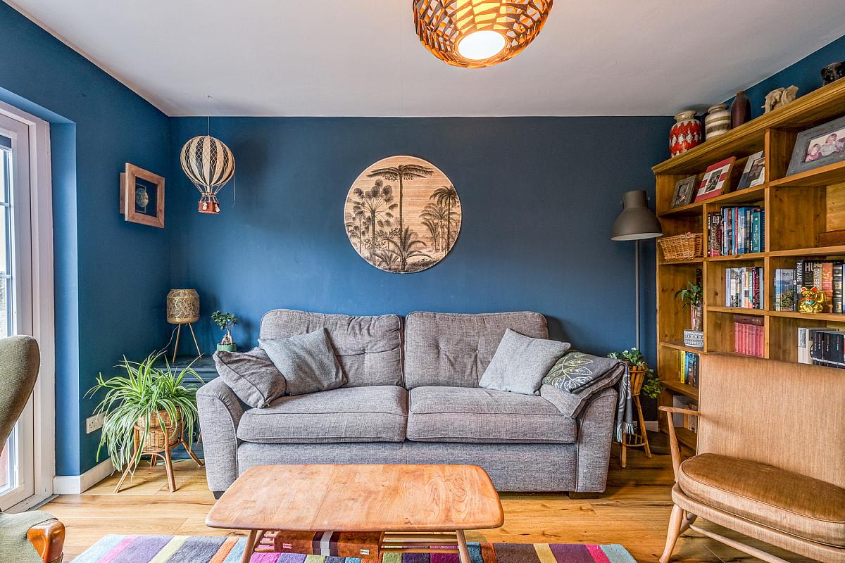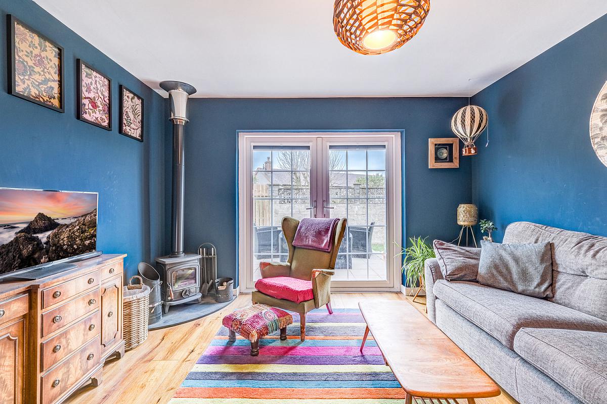 With solid fuel stove, built in bookcase, laminate wood floor and French doors leading to rear patio area.