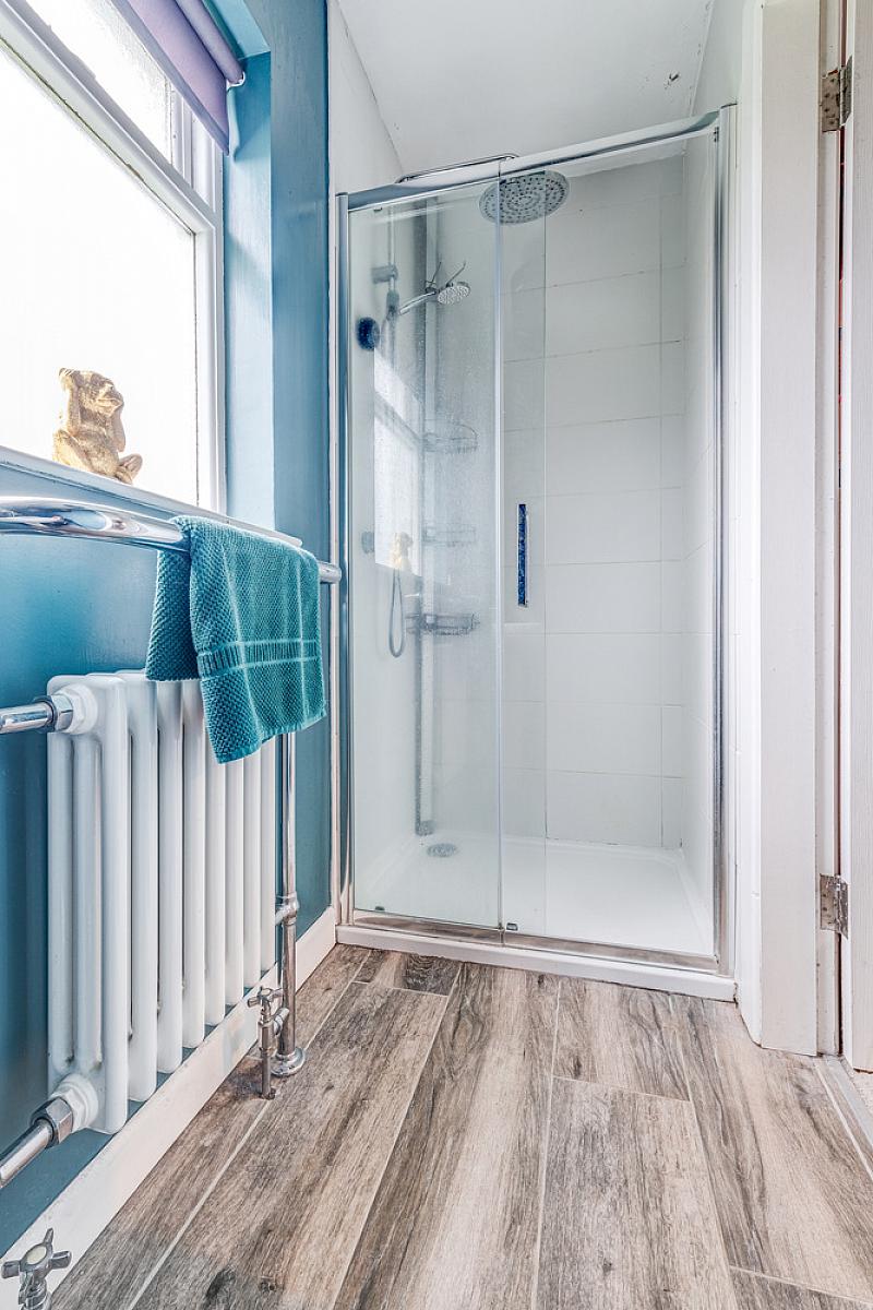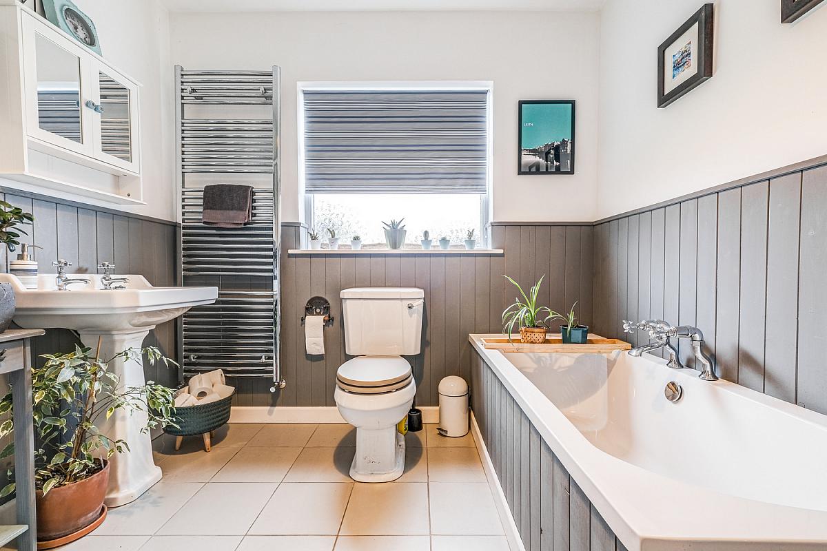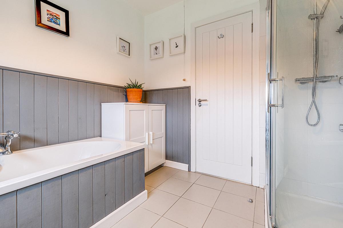 With white suite comprising w.c., wash hand basin, fully tiled walk in shower cubicle with rainfall shower, heated towel rail, part wood panelled walls, mixer taps over wood panelled bath and tiled floor.