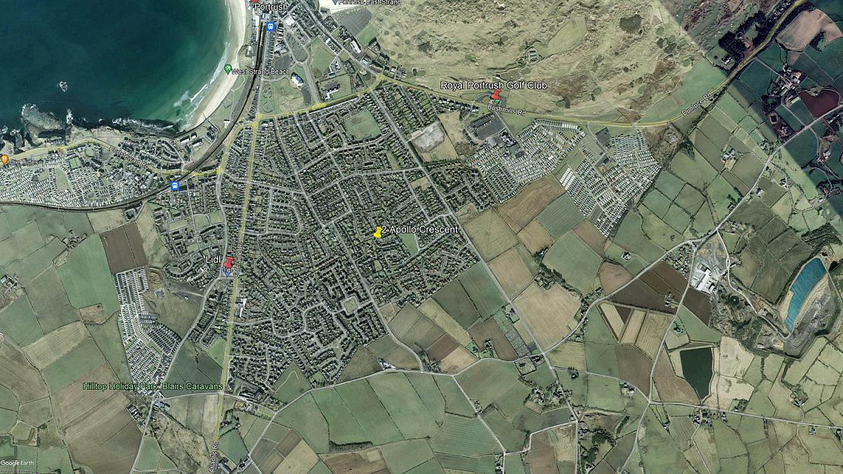 Approaching Portrush on the Coleraine Road take your second right after Lidl onto Glenvale Avenue. Drive to the end of Glenvale, turn right onto Hopefield Avenue and then an immediate left onto Girona Avenue. Take your first right onto Apollo Avenue and then third right into Apollo Crescent. No 2 will be the first bungalow on the corner on your right hand side.