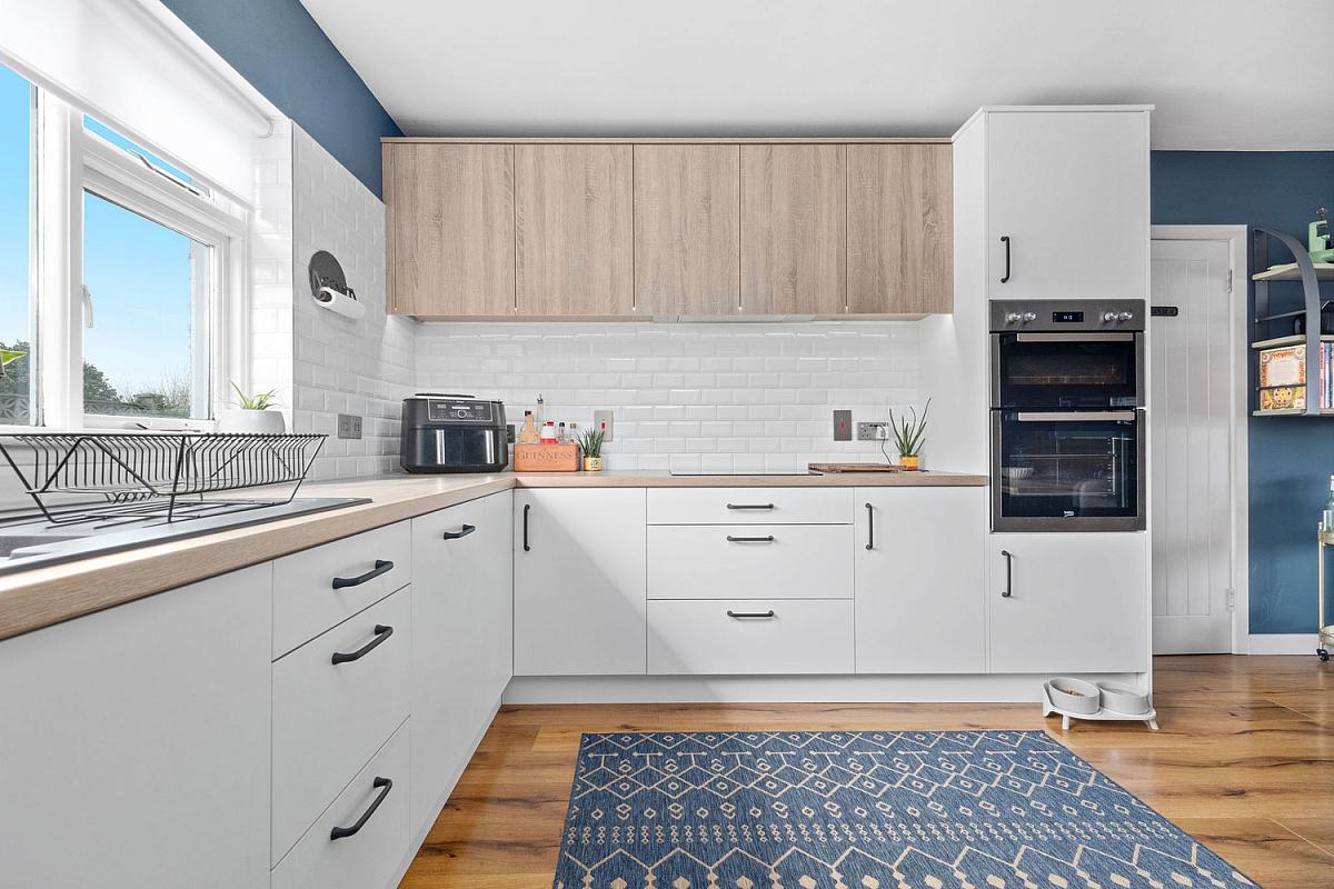 With single drainer stainless steel sink unit, low level units with tiling above, plumbed for automatic washing machine, space for tumble dryer and door leading to integral garage.