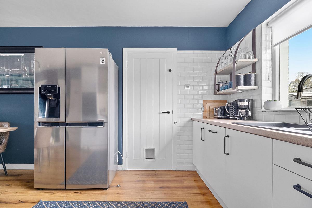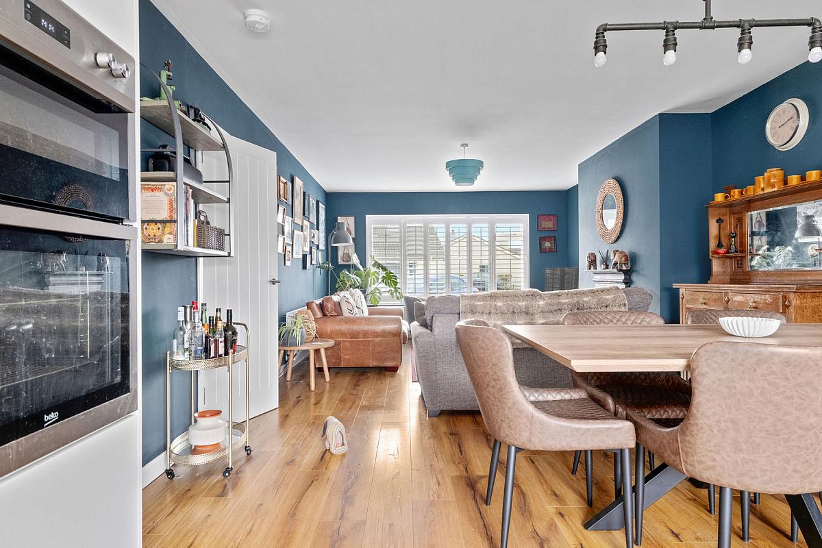 With bowl and half ceramic sink unit, high and low level built in units with tiling between and under unit lighting, integrated ceramic hob with concealed extractor fan above, double eye level Beko ovens, integrated dish washer, plumbed for America style fridge freezer, recycled bin area, saucepan drawers, walk in larder cupboard, recessed lighting, large dining table with seating for six people, laminate wood floor and door leading to utility room.