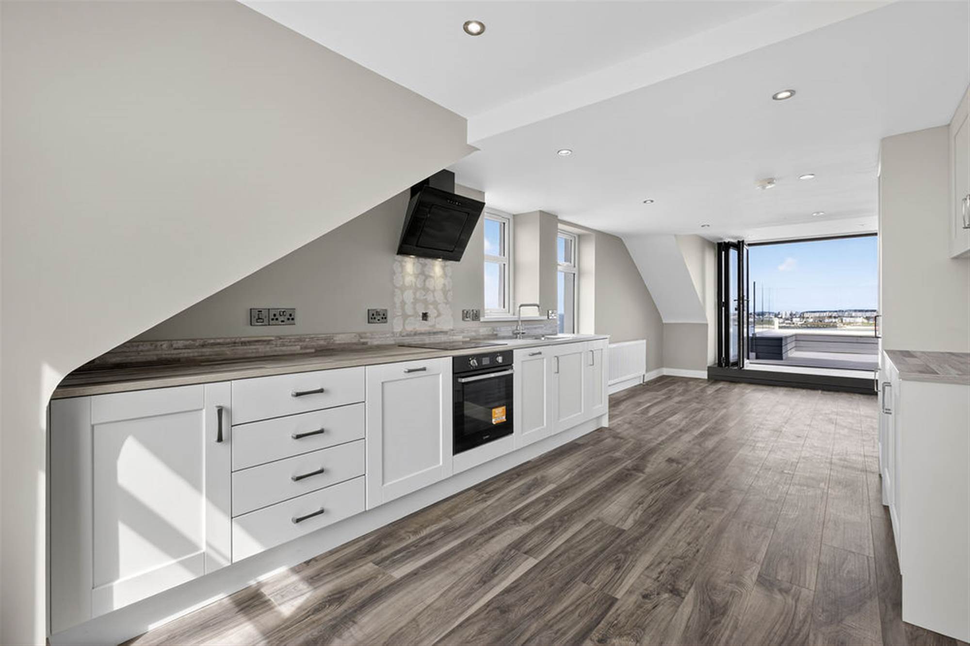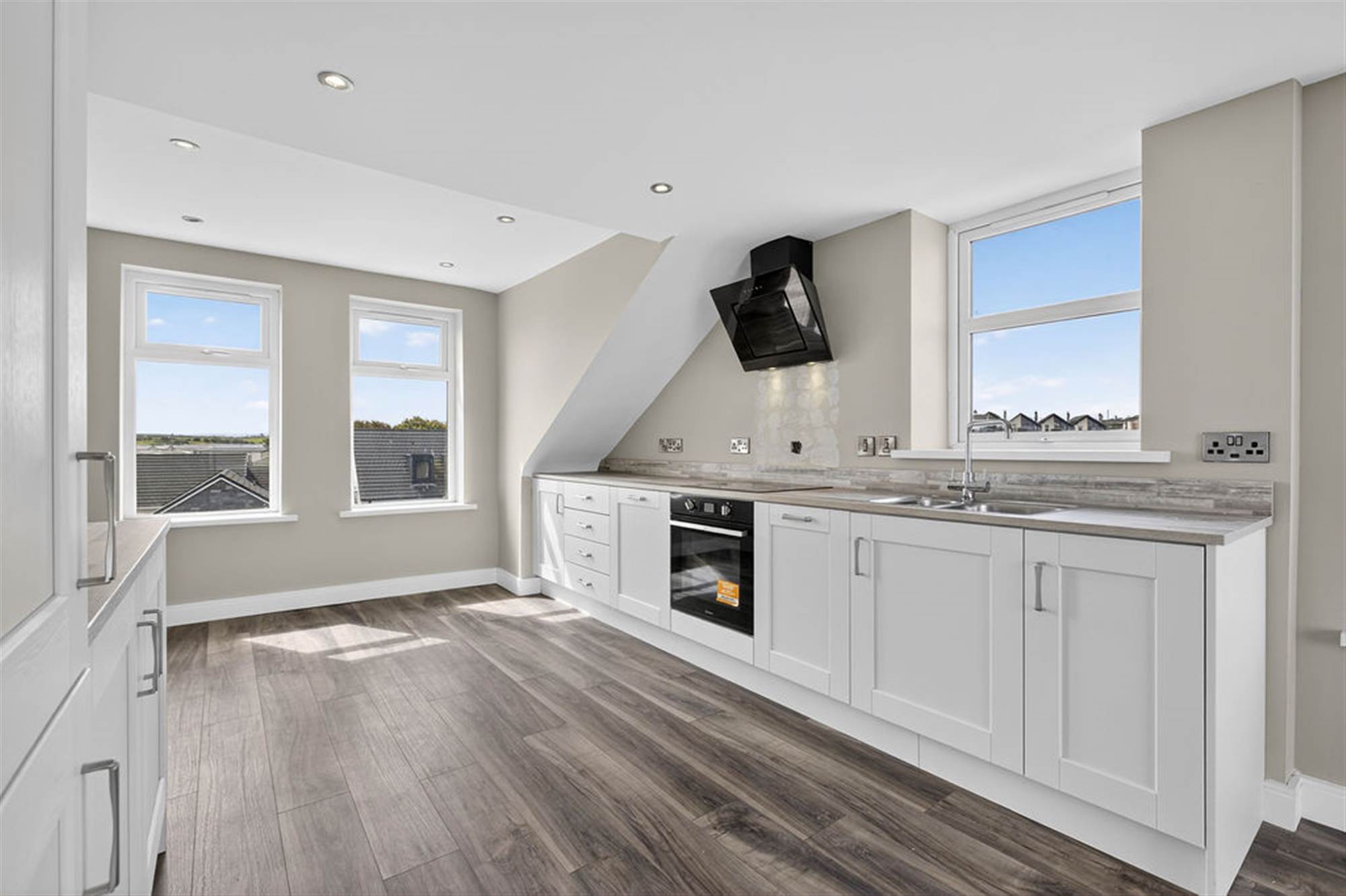 With bowl and half single drainer stainless steel sink unit, wood-effect worktop with upstands, integrated fridge freezer, ceramic hob, integrated oven with extractor fan above, integrated dishwasher, recessed lighting, laminate wood floor and composite step leading to sun fold doors onto composite balcony area with uninterrupted panoramic views across Atlantic Ocean, West Strand Beach, Portrush Harbour, Ramore Headland and beyond over to the Donegal Headland (into bay).