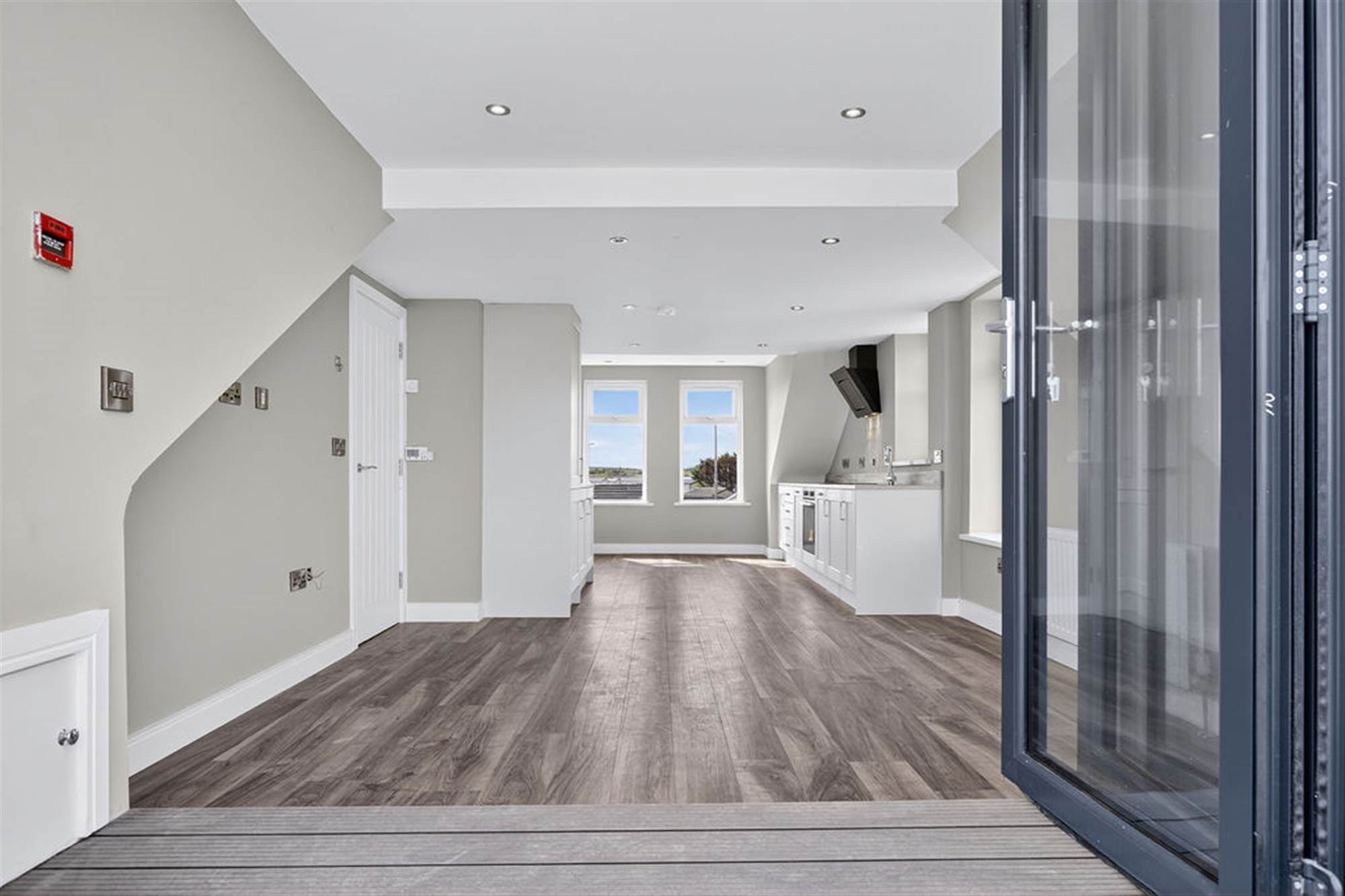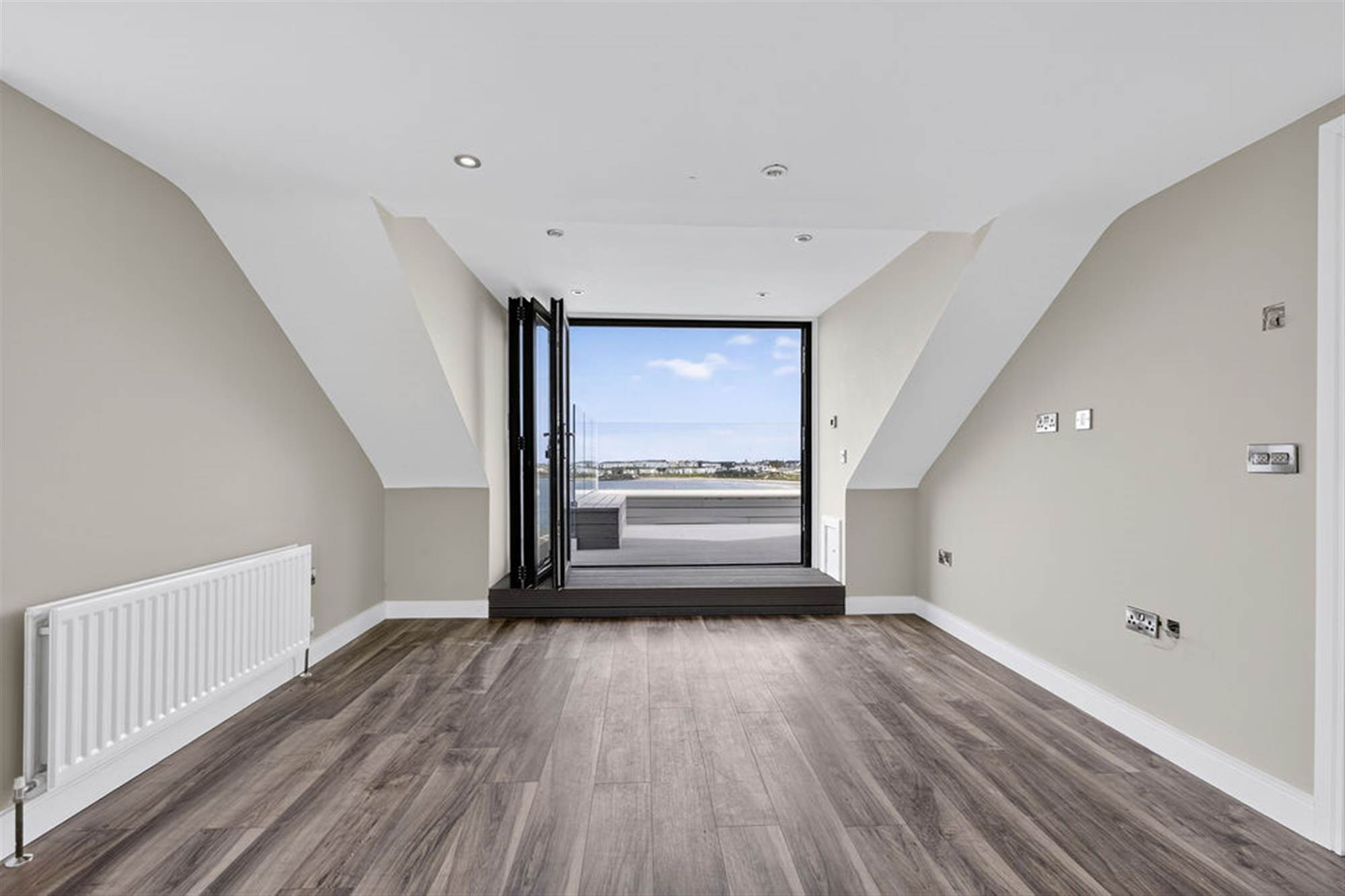 Bi Folding Double Glazed Doors To Living Room With Sea Views Opening Out To A Roof Terrace With Panoramic Sea & Coastal Views Finished In Composite Decking.