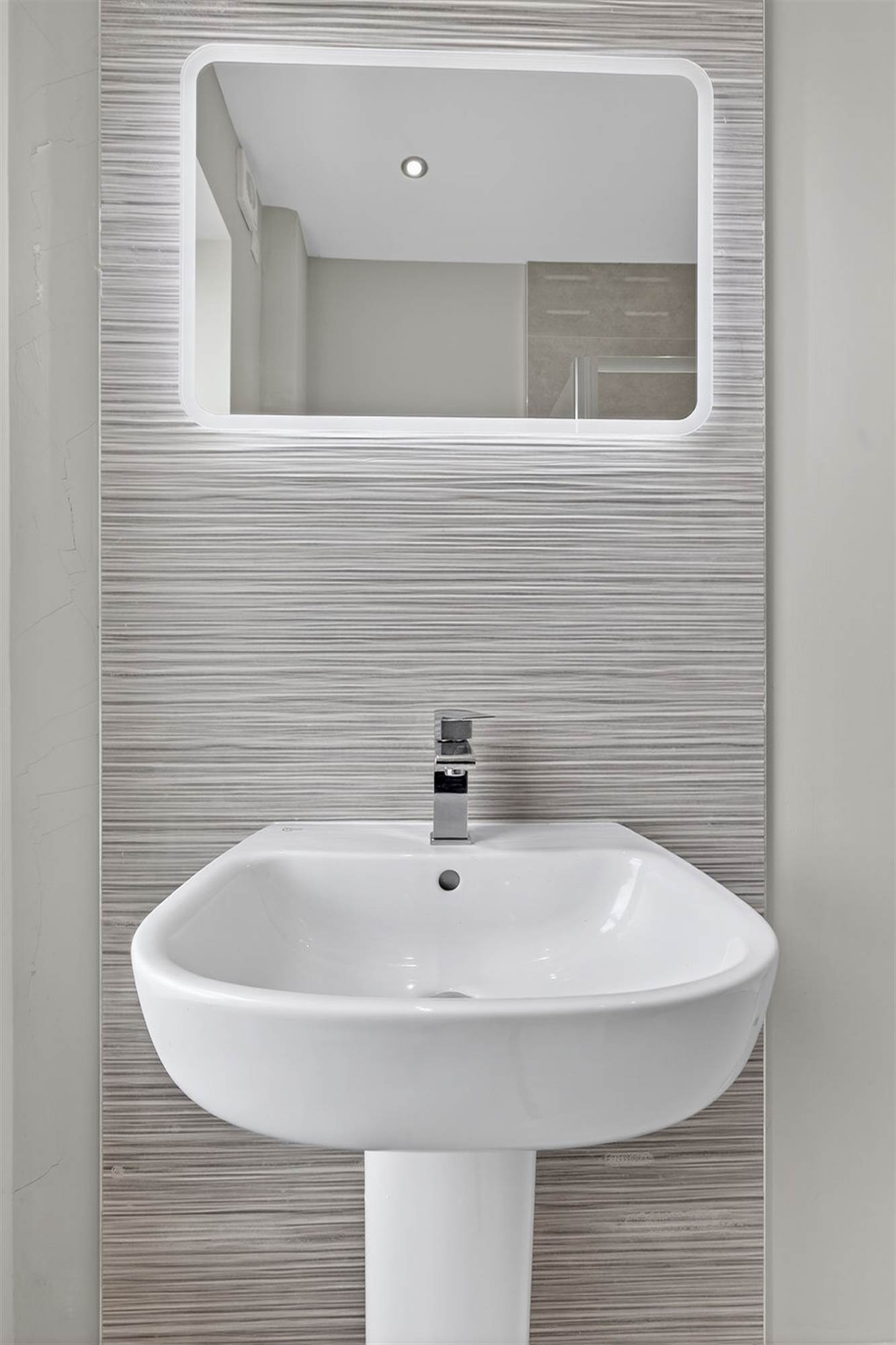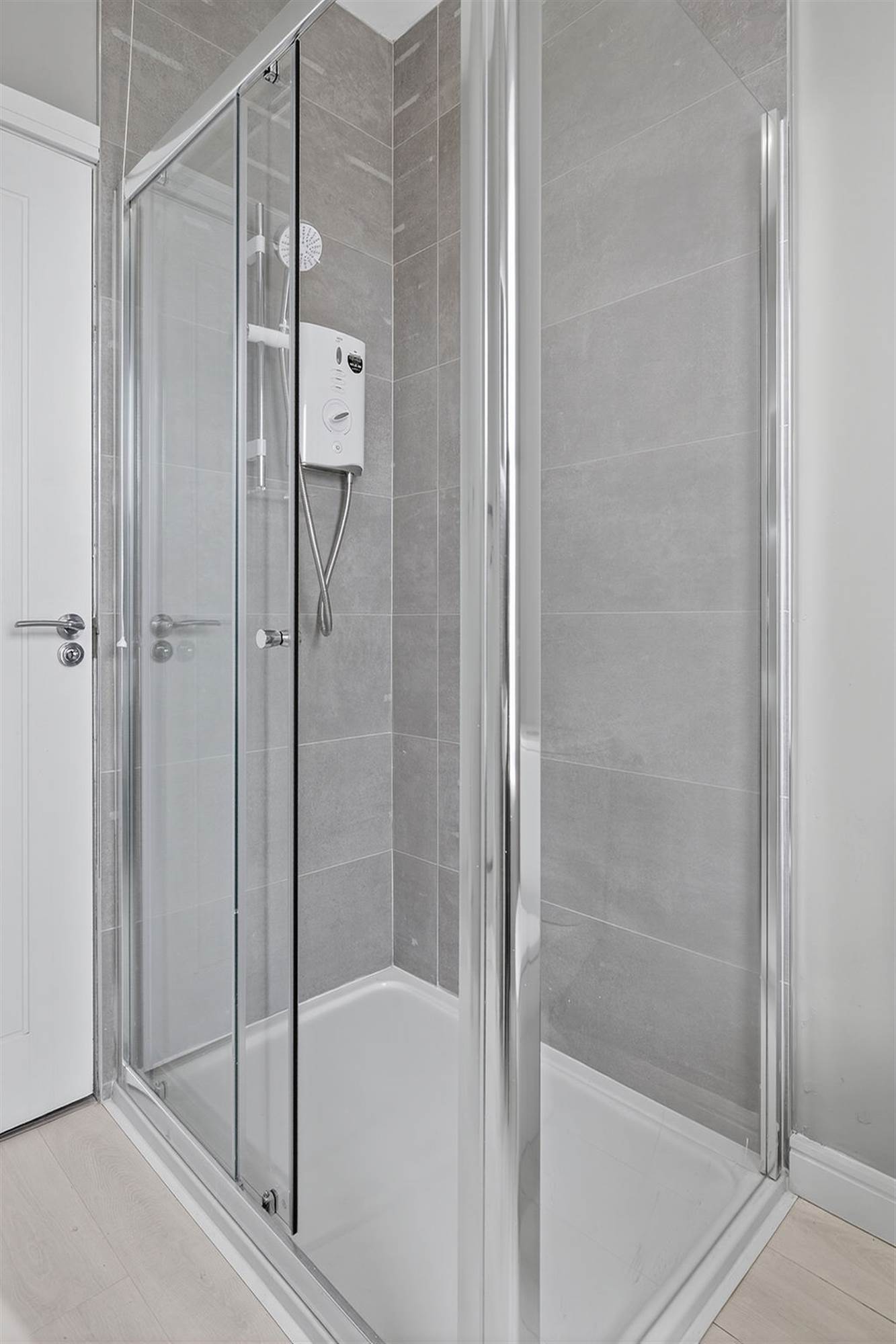 With white suite comprising w.c., wash-hand basin with illuminated mirror above, fully PVC clad walk in shower cubicle with electric shower head, heated towel rail, extractor fan, recessed motion censored lighting and laminate wood floor.