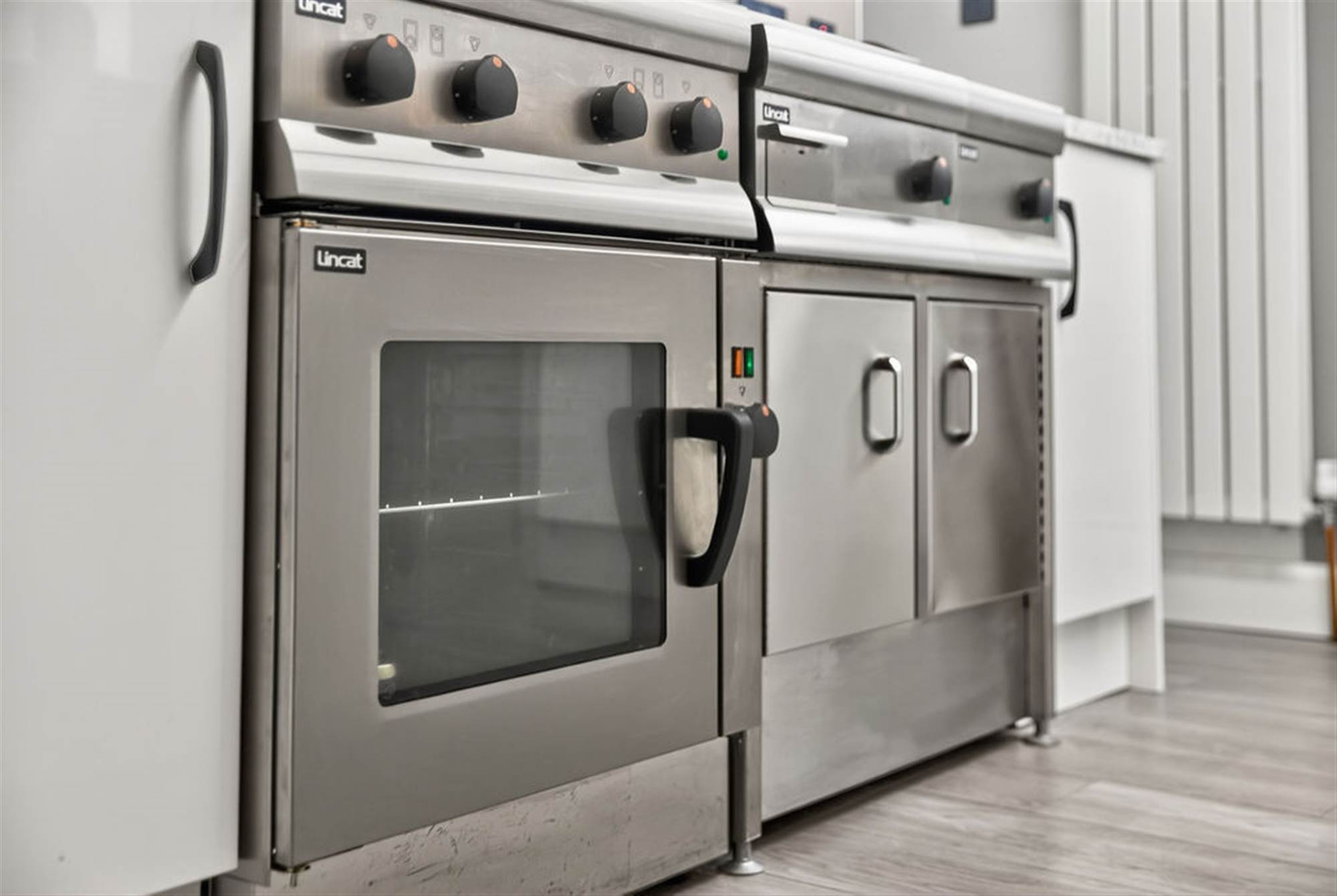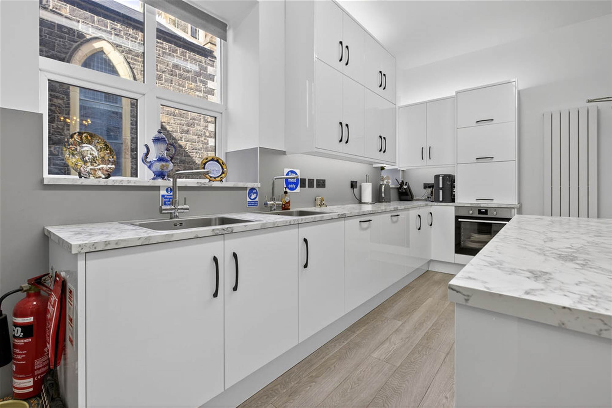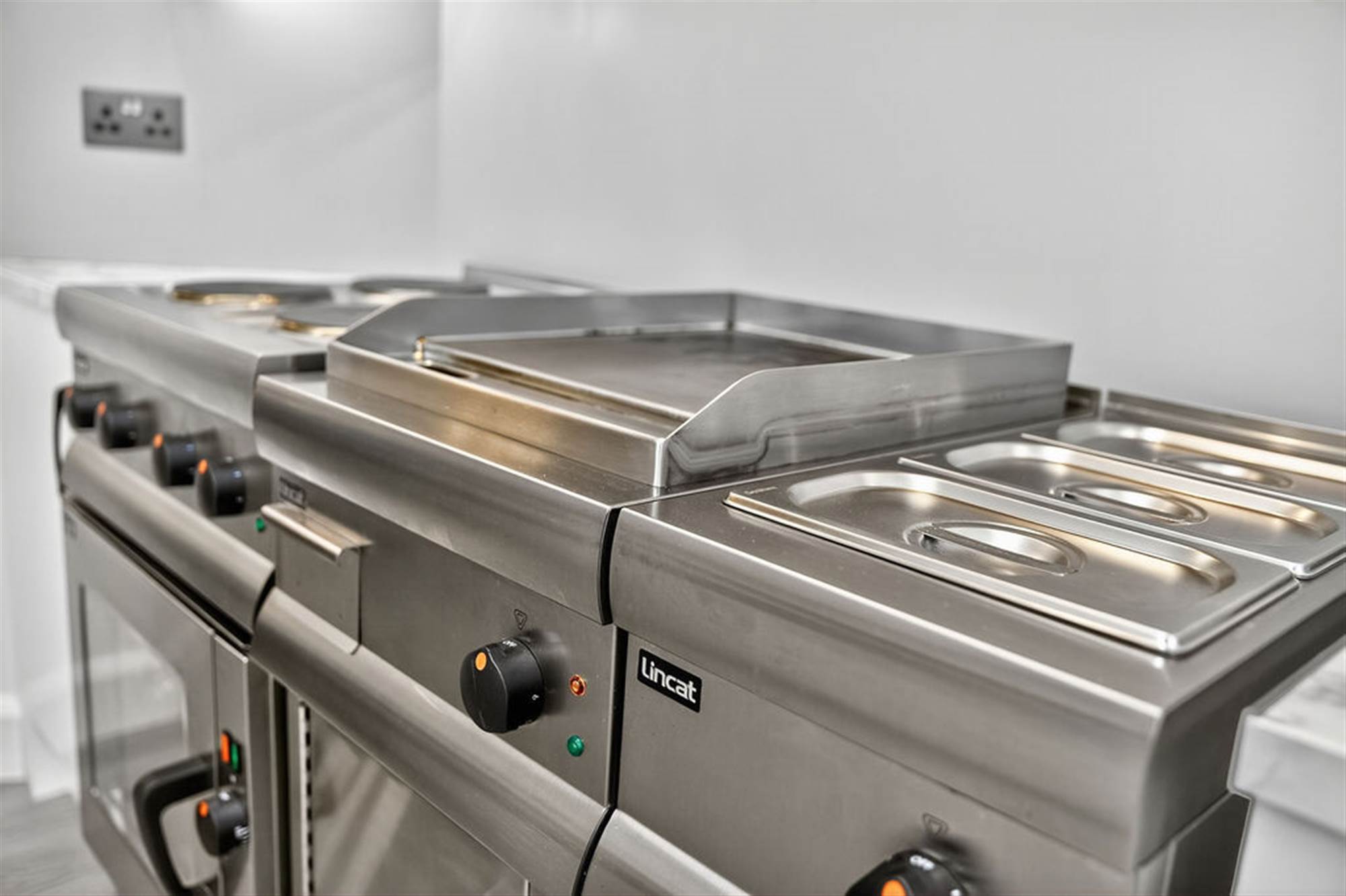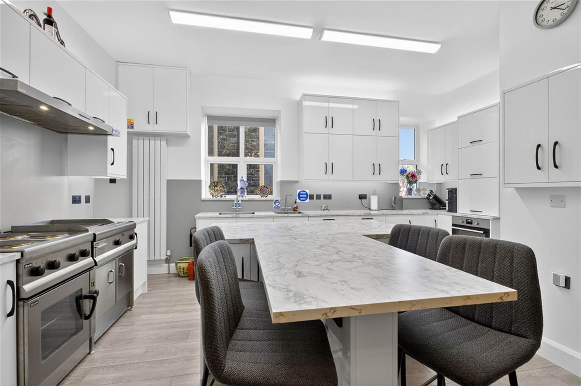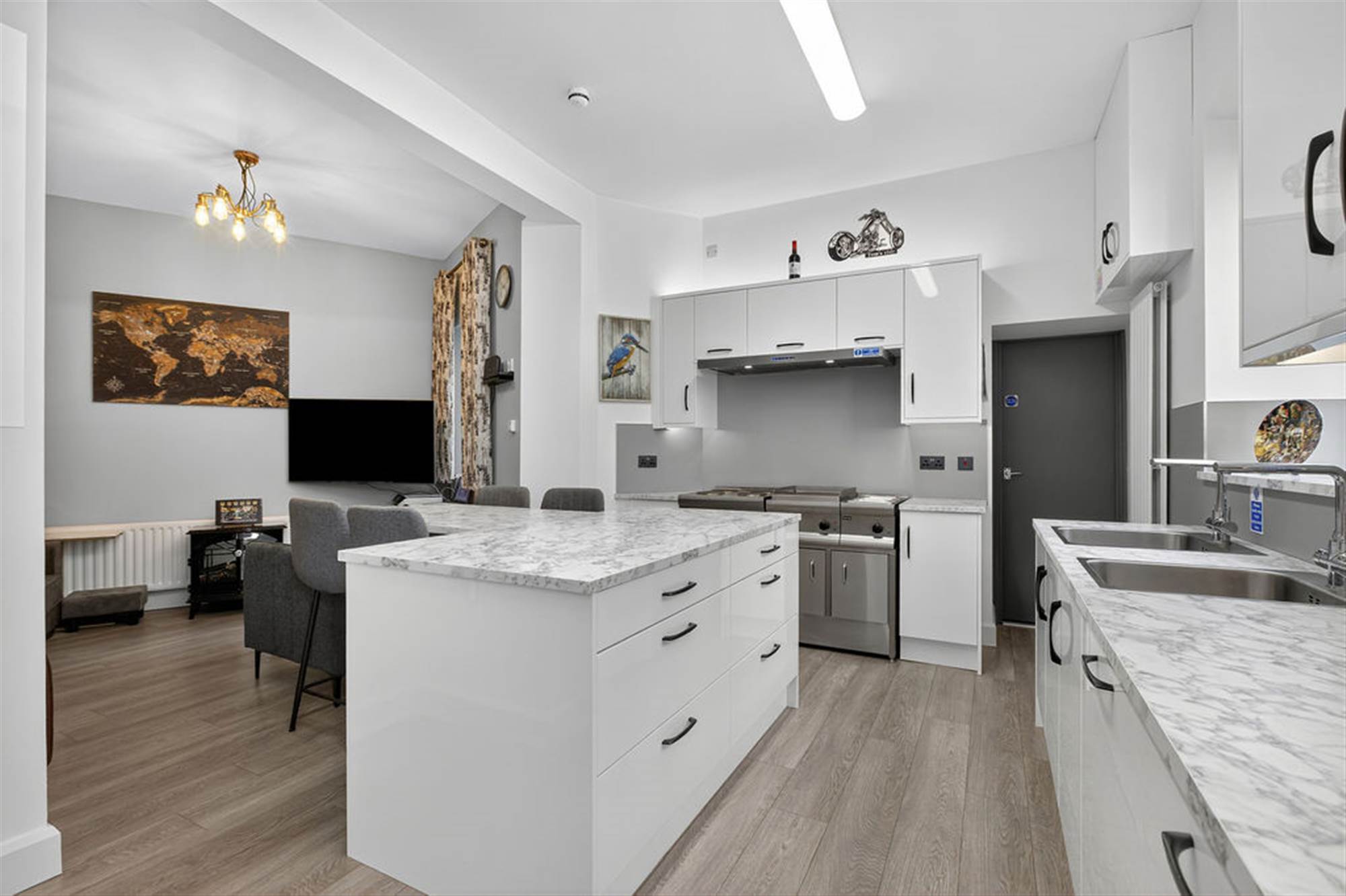 With two "Blanco" stainless steel sink unit, high and low level built in units, space for "Lincat" electric oven with hot plates, "Ban Marie" storage, stainless steel thin extractor fan, integrated oven and grill, matching island with breakfast bar with seating and storage below, strip lighting and laminate wood floor.