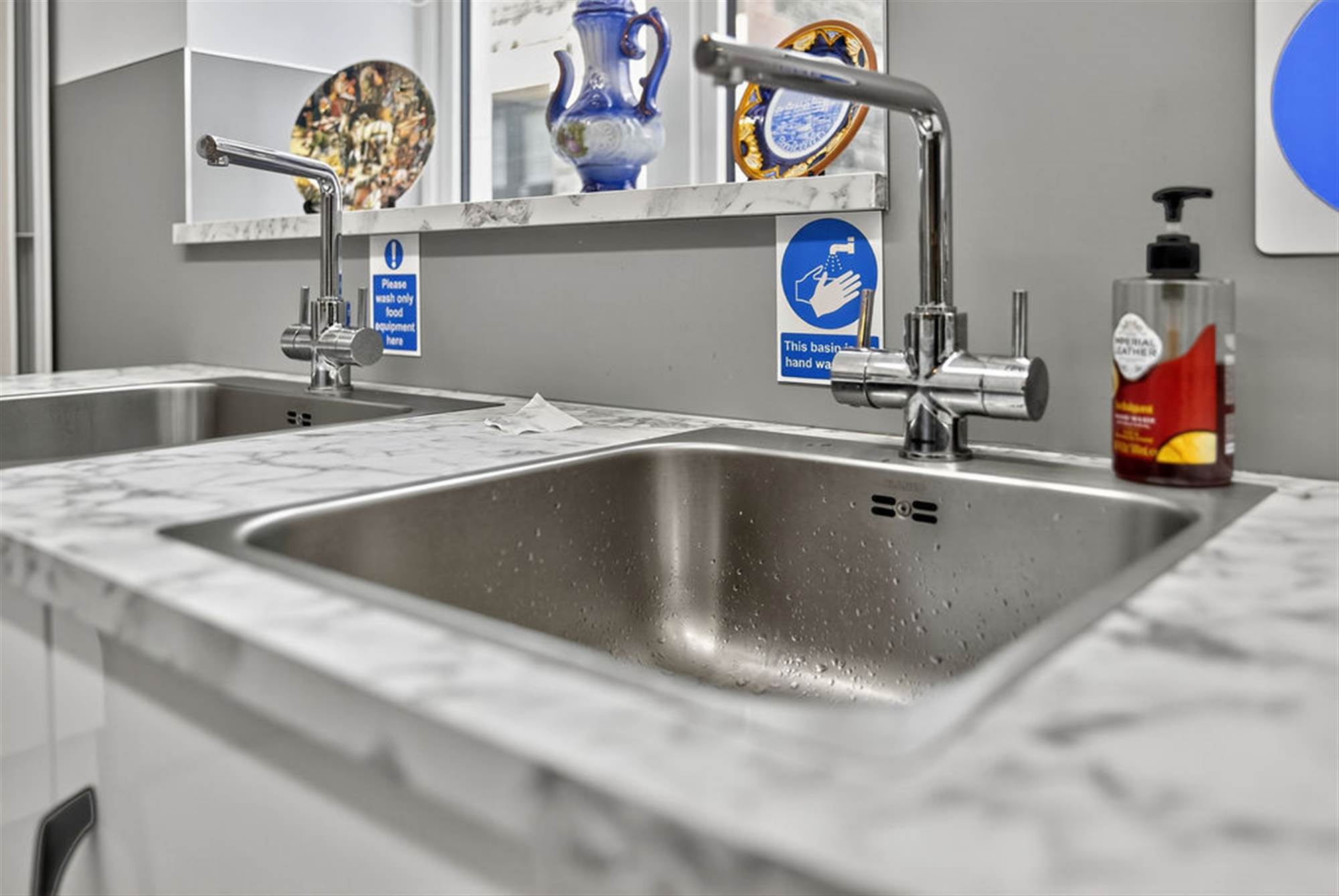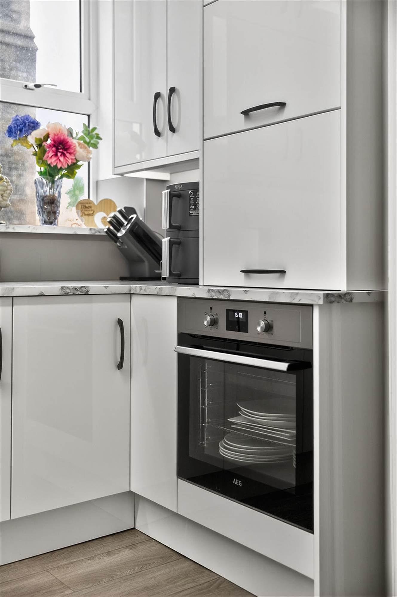With plumbing for automatic washing machine, space for tumble dryer, boiler, half tiled walls and space for fridge.