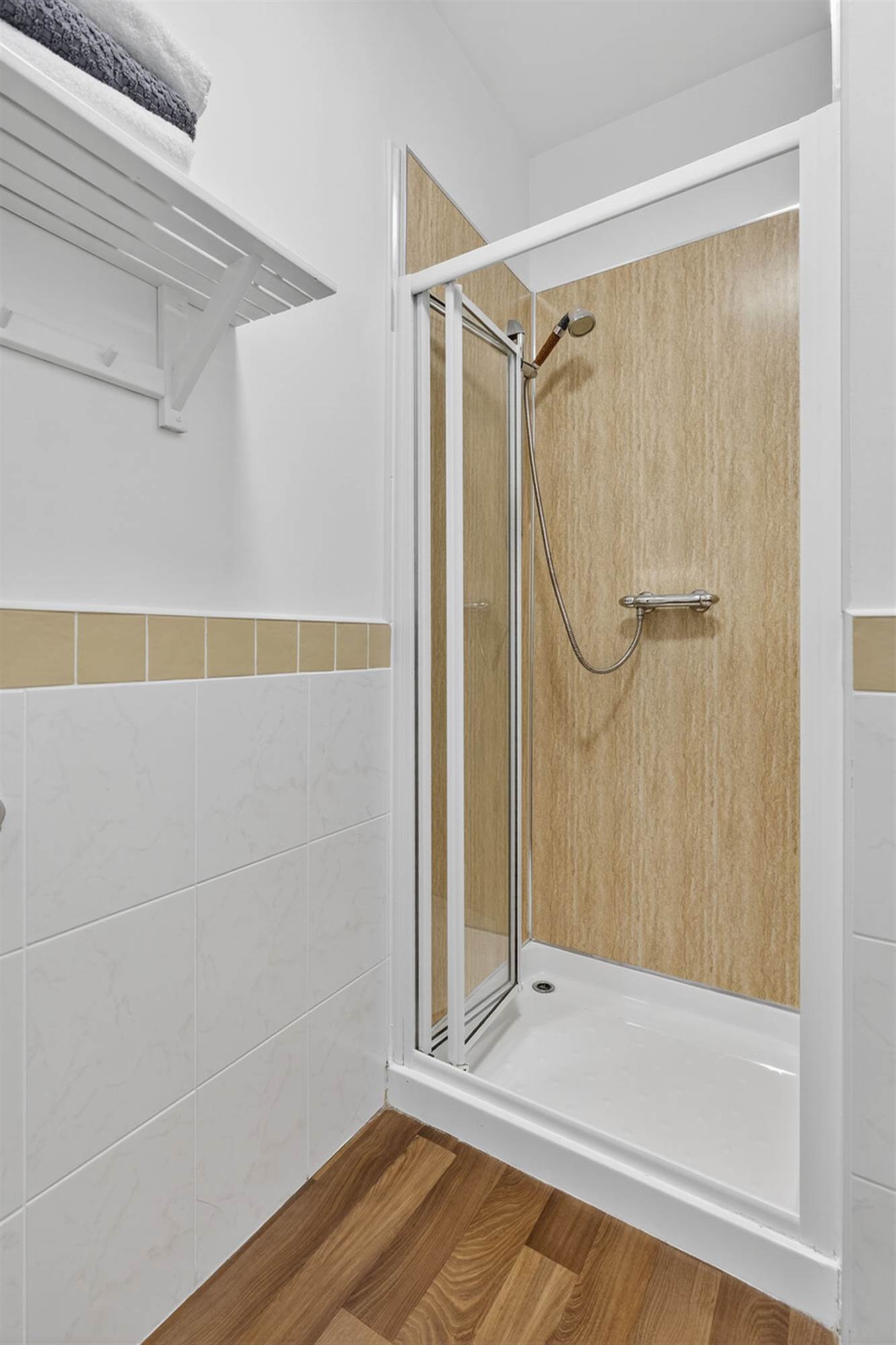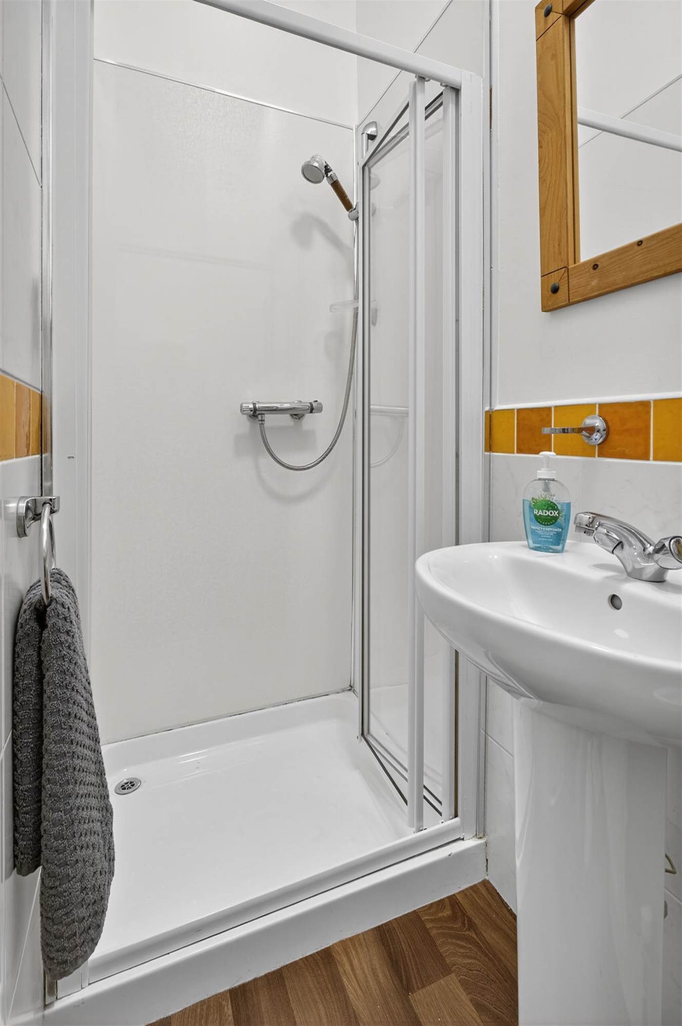 Ensuite off with w.c., wash hand basin, fully tiled walk in shower cubicle with mains shower, half tiled walls, shaver point and light, storage, hot tank and extractor fan.