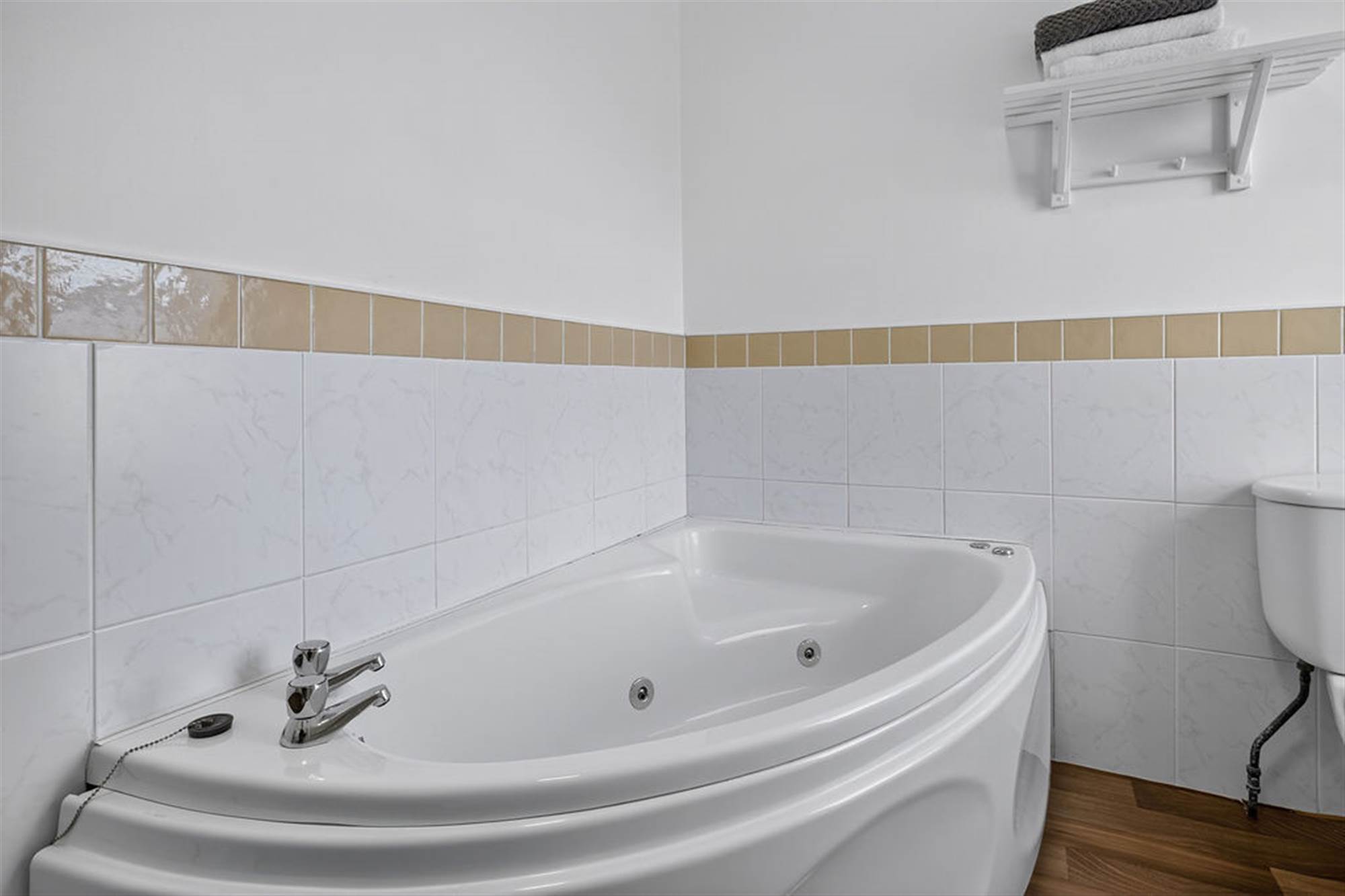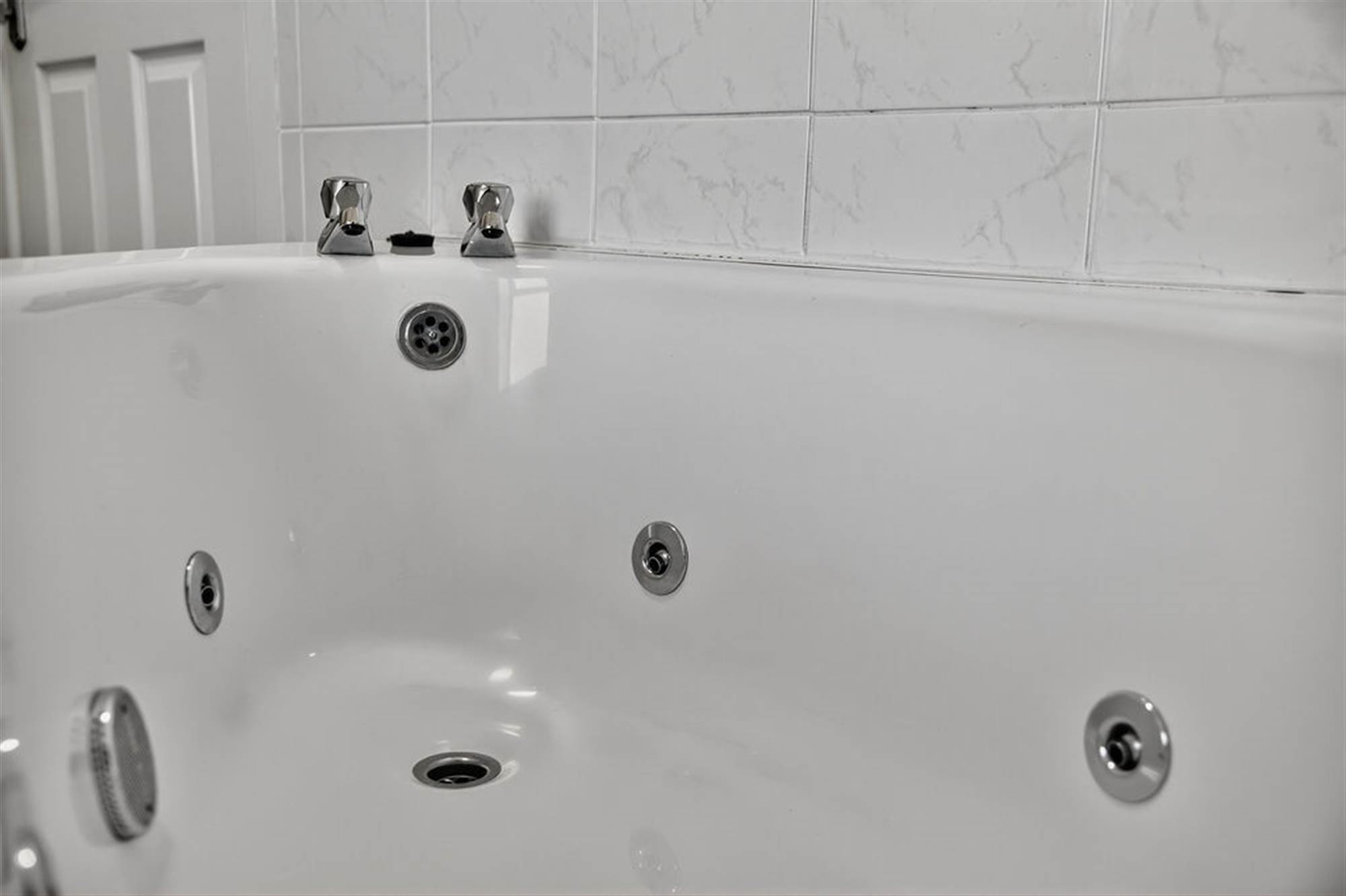 With white suite comprising w.c., wash hand basin, fully tiled walk in shower cubicle, half tiled walls, shaver point and light and corner jet bath with PVC panelling.
