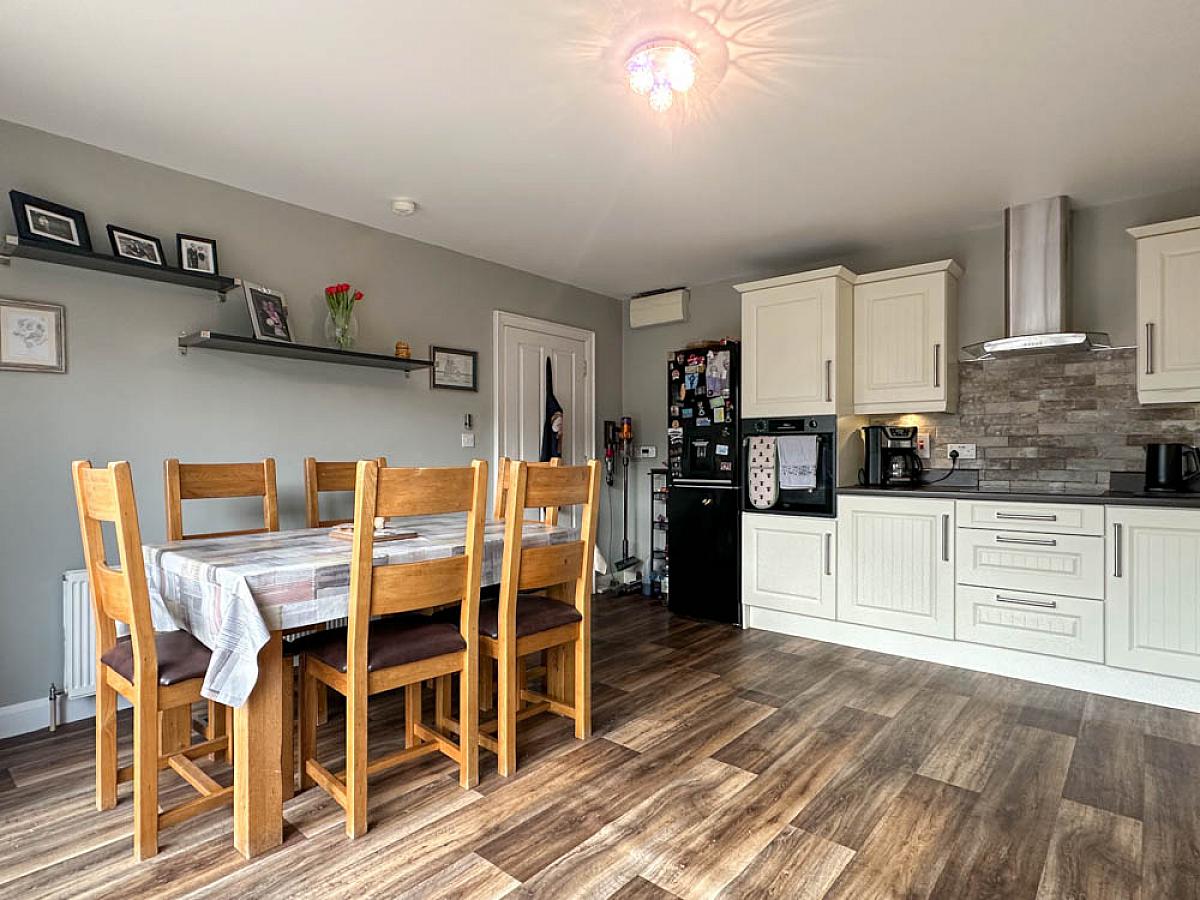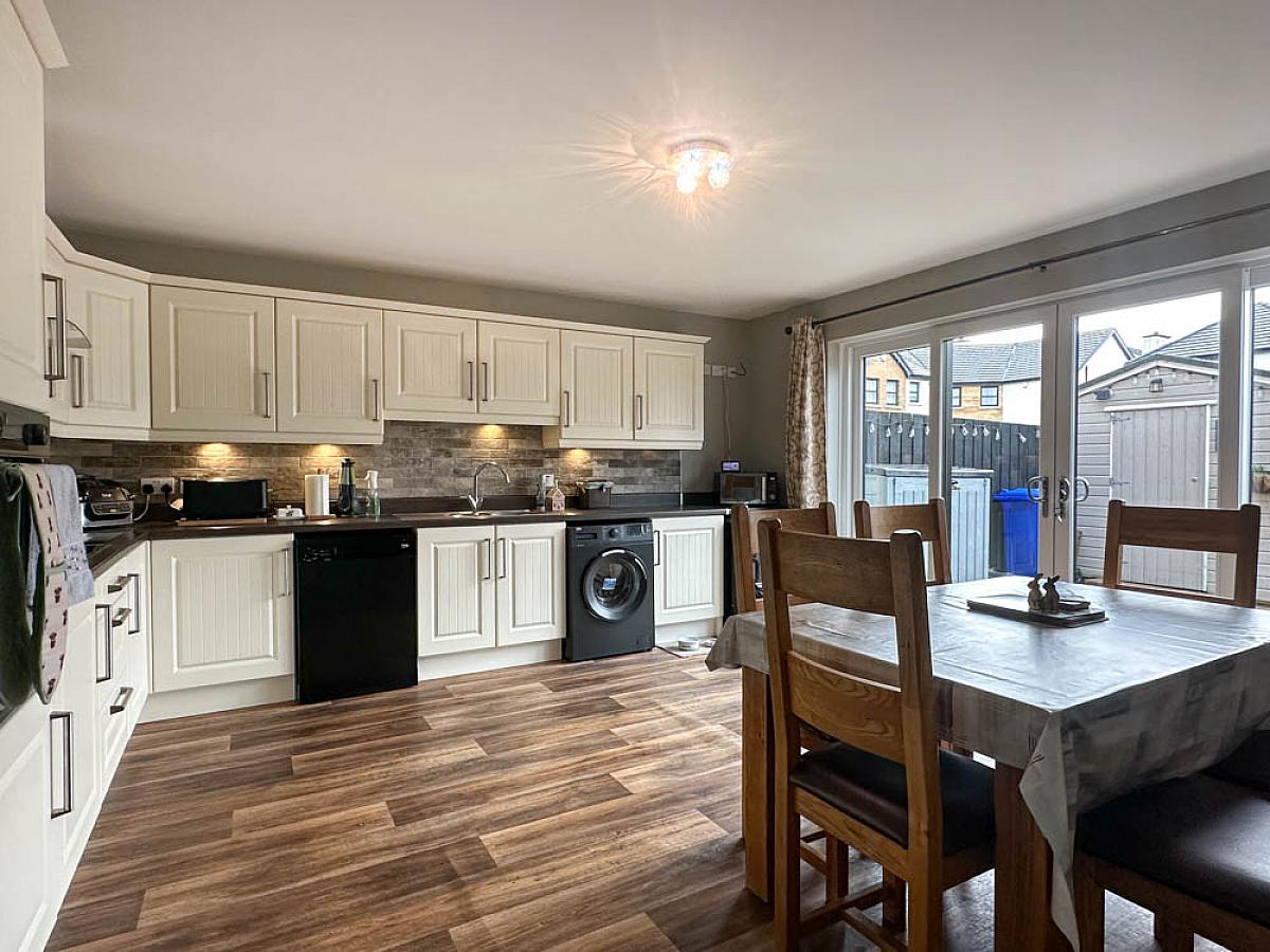 with eye and low level units, tiled between units, one and a half bowl stainless steel sink unit, concealed lighting, stainless steel extractor fan, Indesit hob, Beko oven, space for fridge / freezer, space for tumble dryer, plumbed for washing machine, plumbed for dishwasher, television point, sliding patio doors to the rear yard.