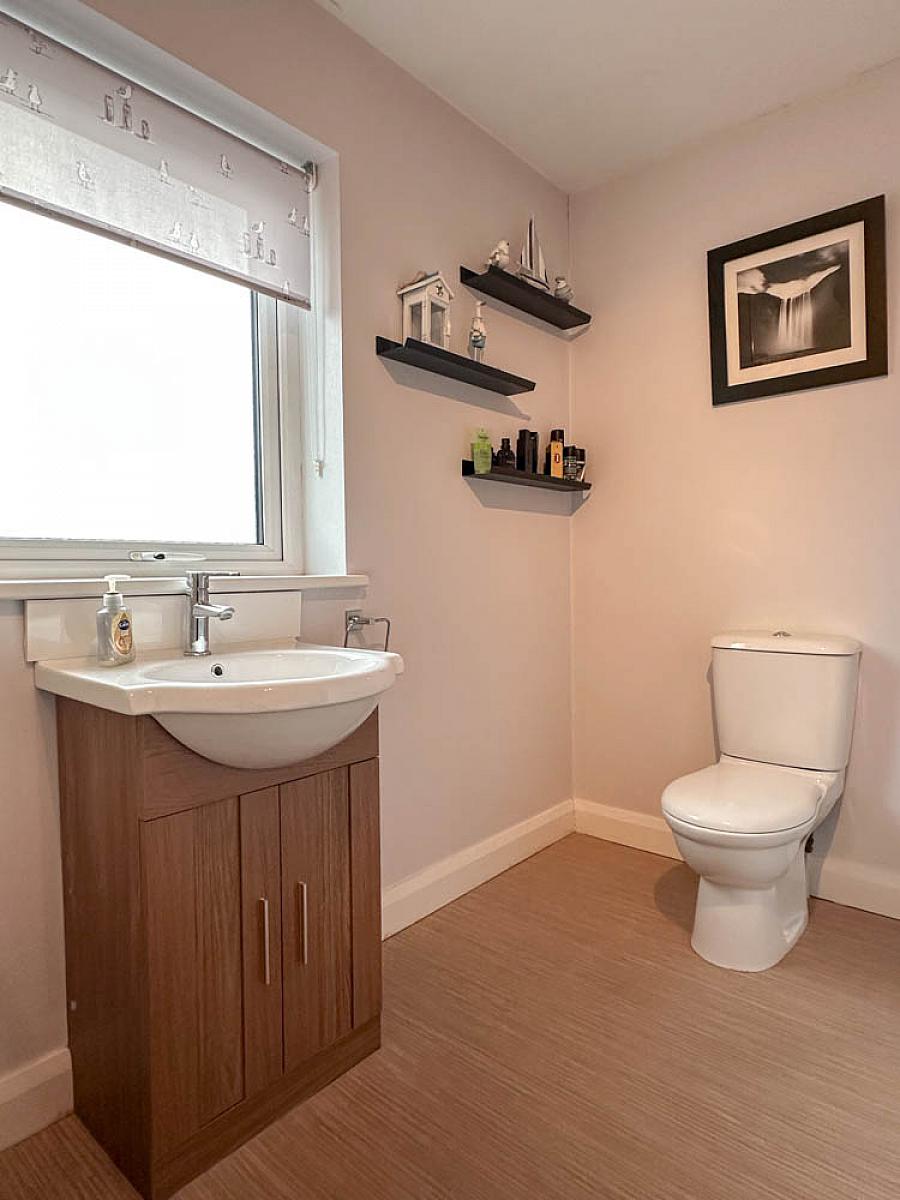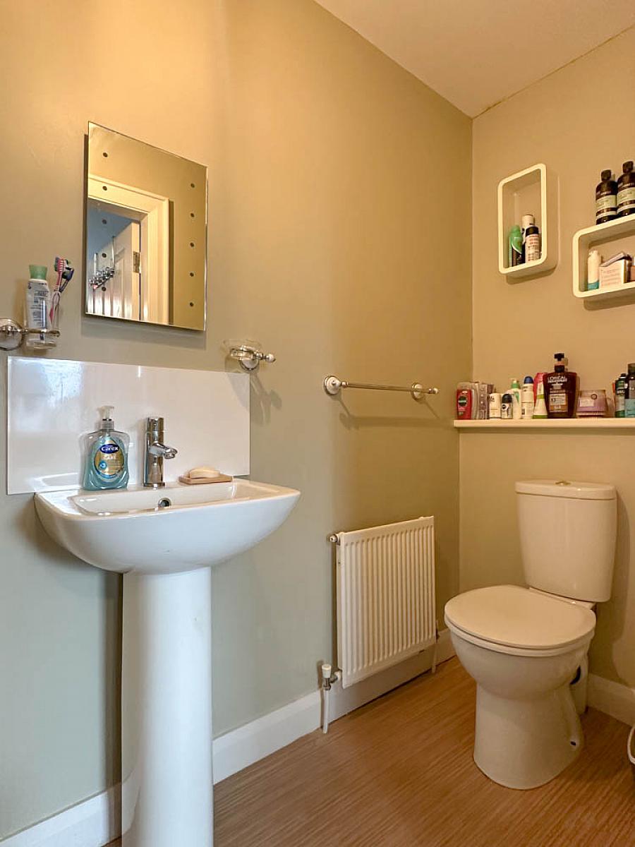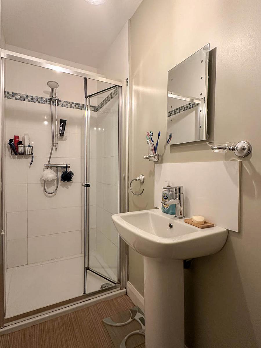Comprising tiled shower cubicle with mains shower fitting, wash hand basin, w.c., extractor fan.