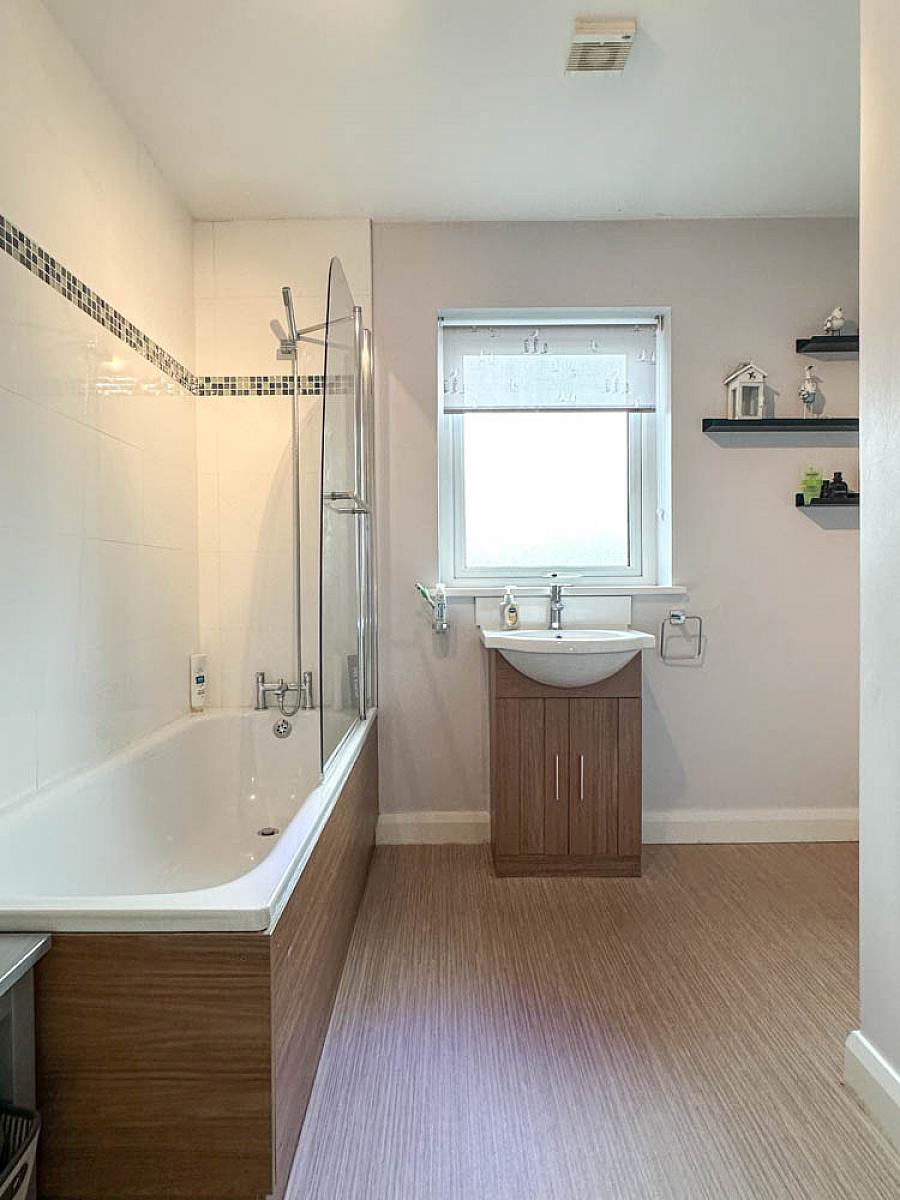 Comprising panel bath with telephone hand shower and shower screen over, wash hand basin set in vanity unit, w.c., extractor fan, recess storage.