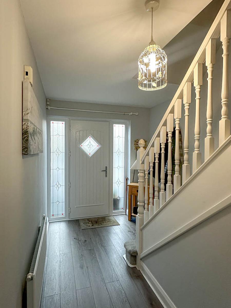 with composite front door and glass side panels, wooden effect flooring, telephone point.