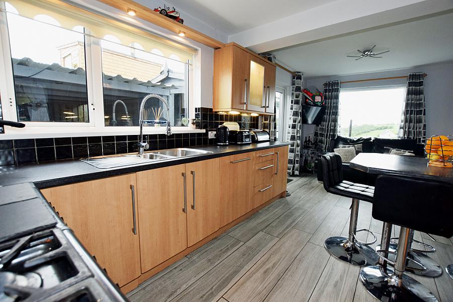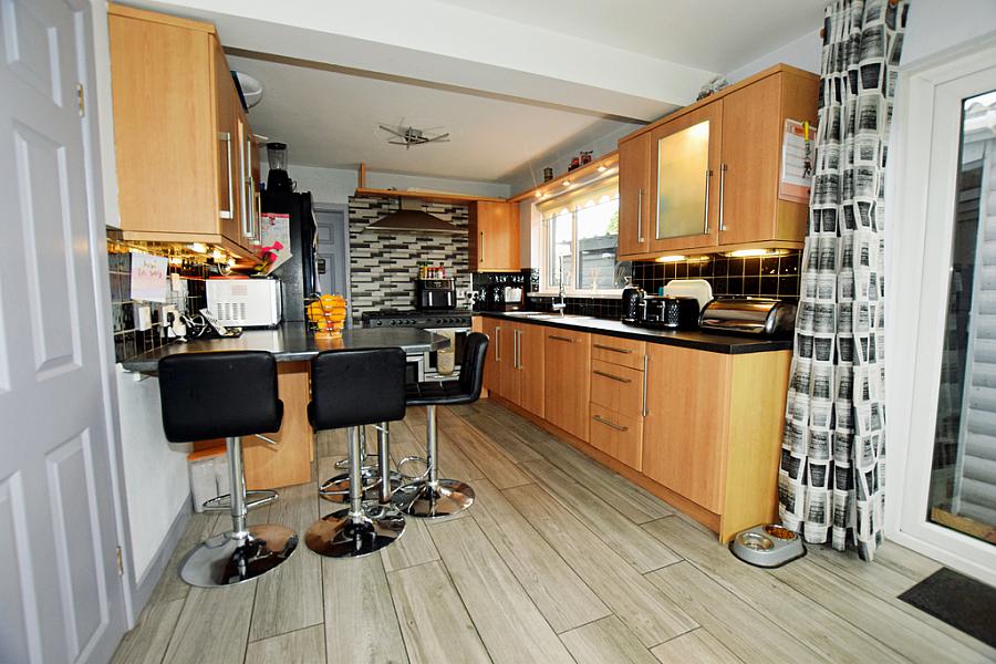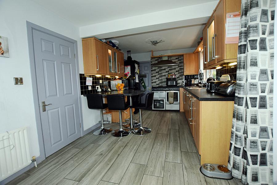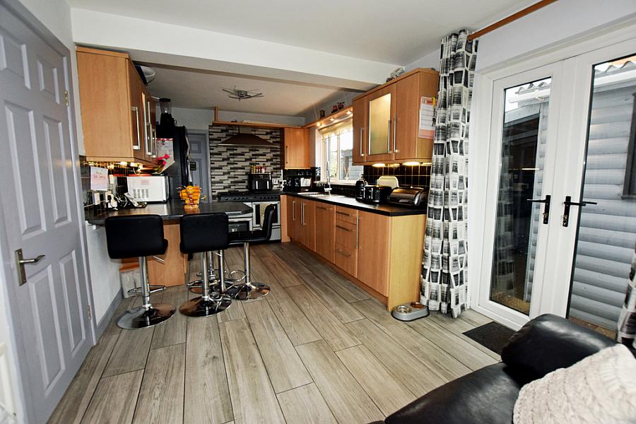 With fully fitted range of eye and low level unit with tiling between and under lighting, one and a half bowl stainless steel sink unit, space for cooker with extractor fan, integrated dishwasher, integrated low level fridge, breakfast bar, French doors to side and tiled floor.