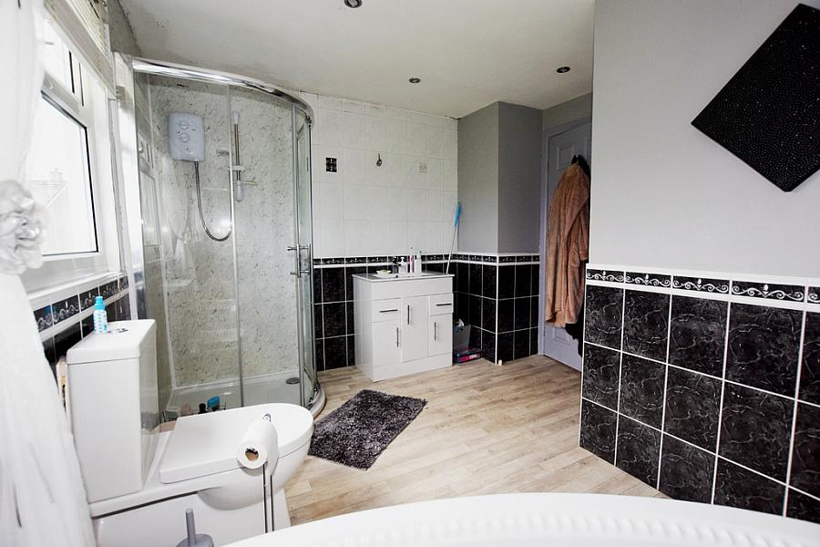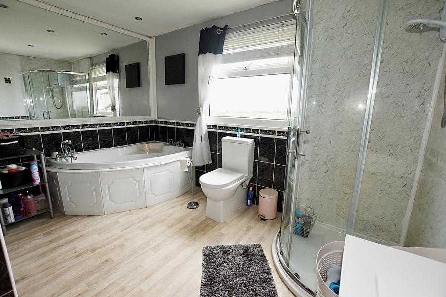 Suite comprising corner bath with hand shower attachment, PVC walk in shower cubicle, wash hand basin with under storage, recessed light and half tiled walls.