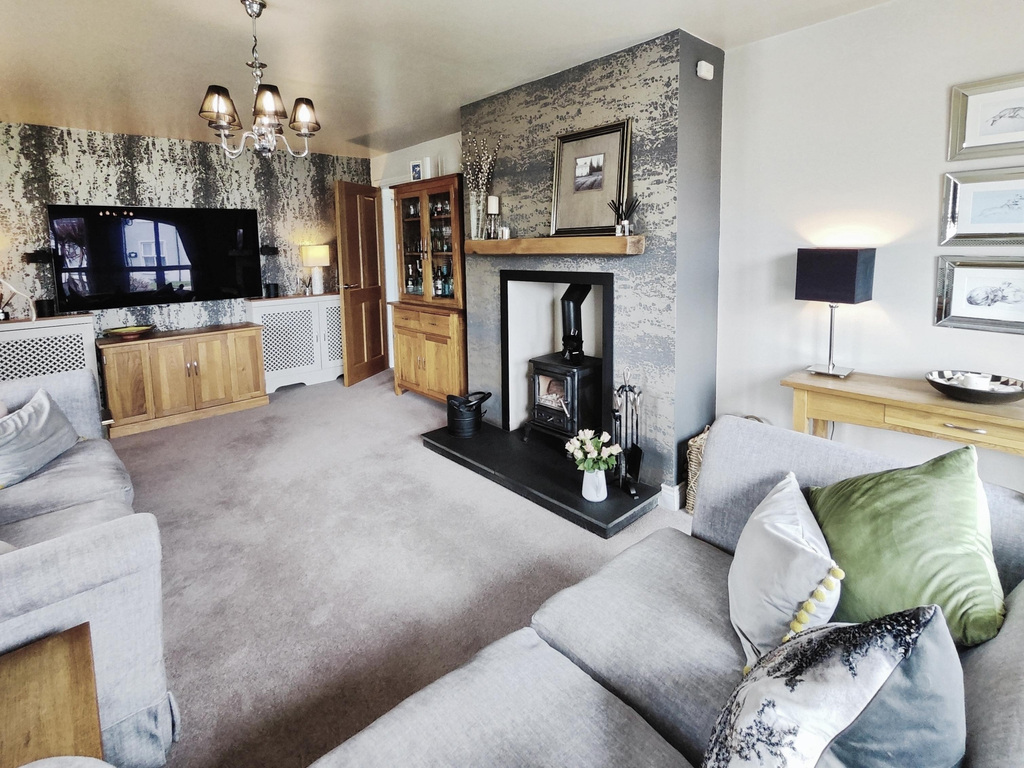 With multi fuel stove with beam mantle and tiled hearth, TV point, radiator covers with storage.