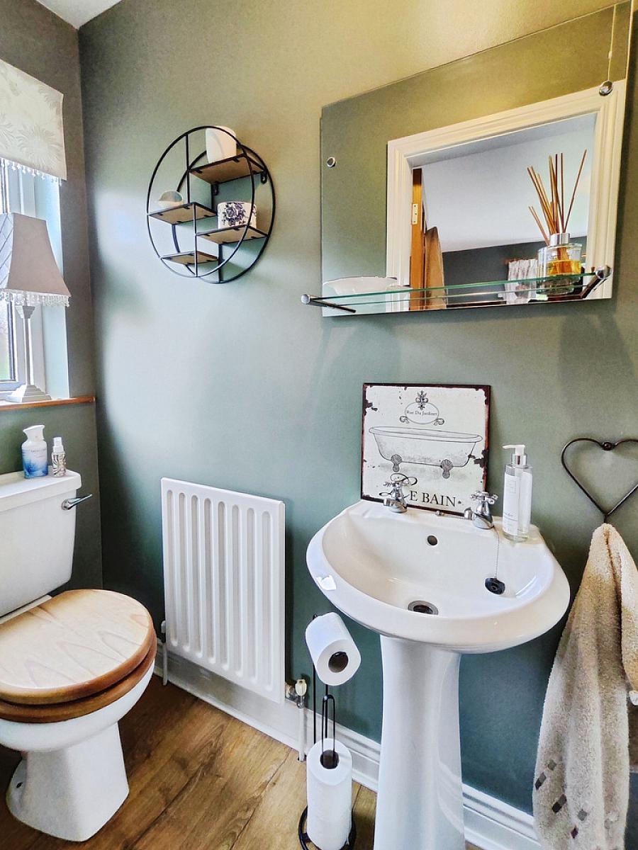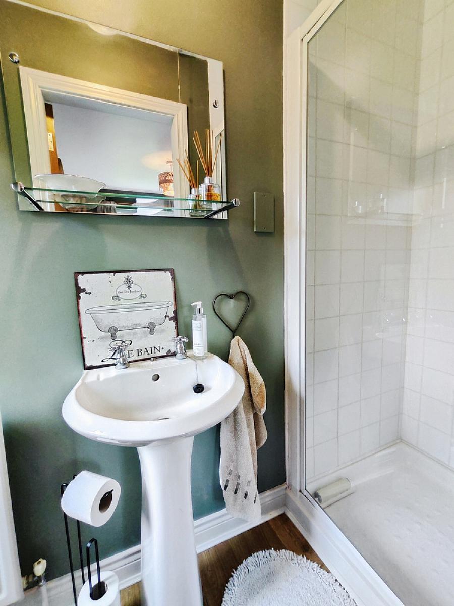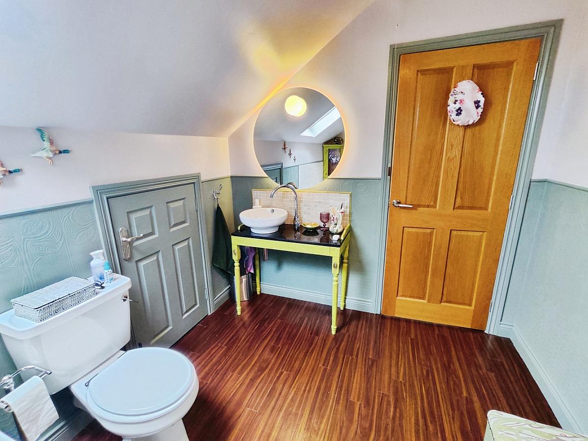 With laminate flooring. En-suite comprising fully tiled walk in shower cubicle with mains shower, wc and wash hand basin.