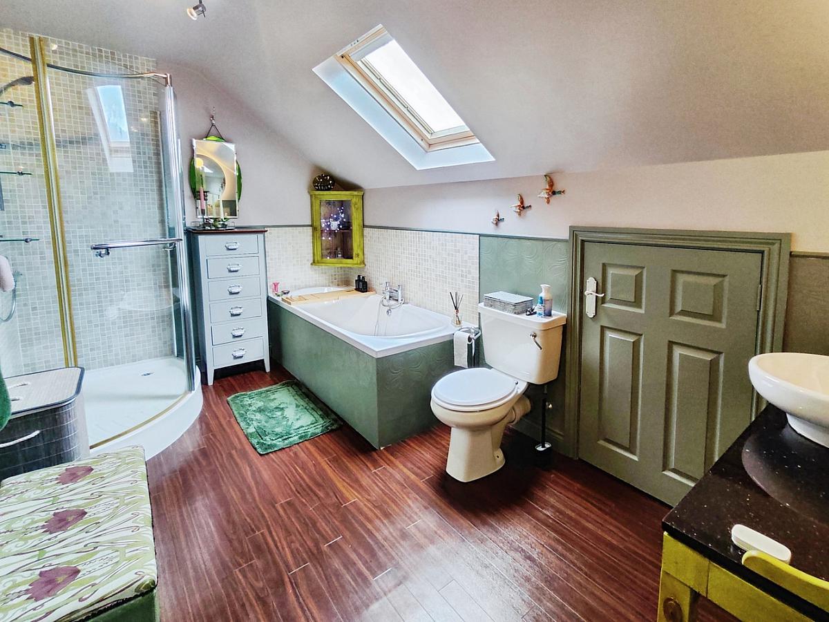 Suite comprising fully tiled walk in shower cubilcle with mains shower, bath with hand shower attachment and tiled splash back, wash hand basin with tiled splash back, wc, feature heated towel rail, direct access to large eaves space and 'Amtico' vinyl flooring.