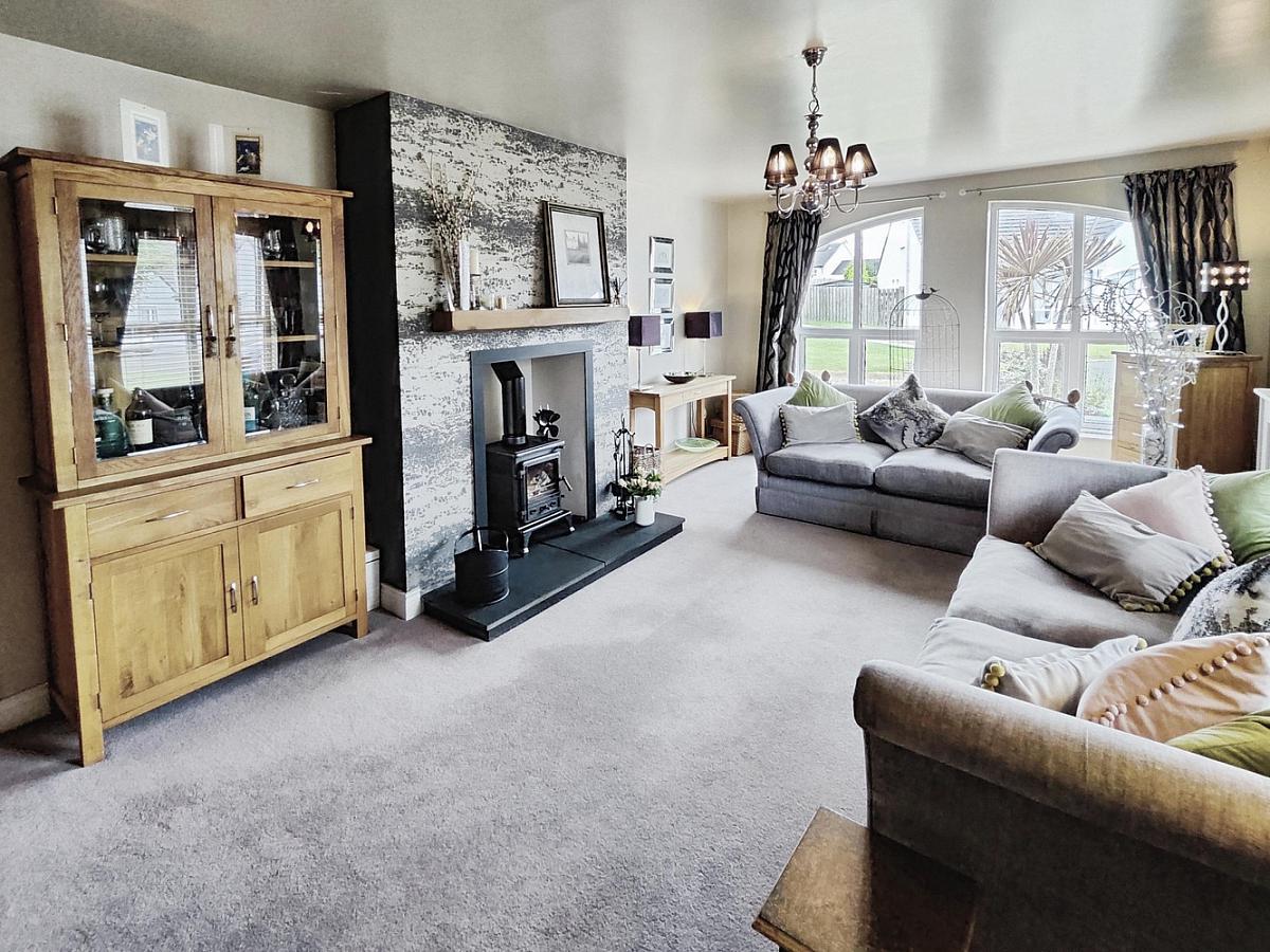 With multi fuel stove with beam mantle and tiled hearth, TV point, radiator covers with storage.