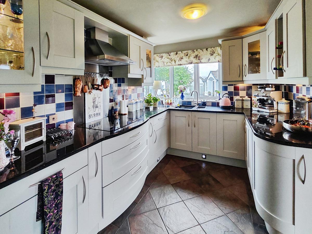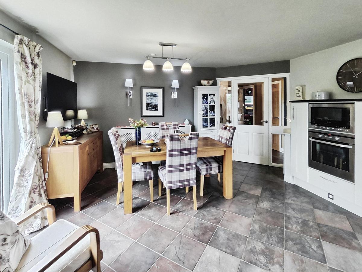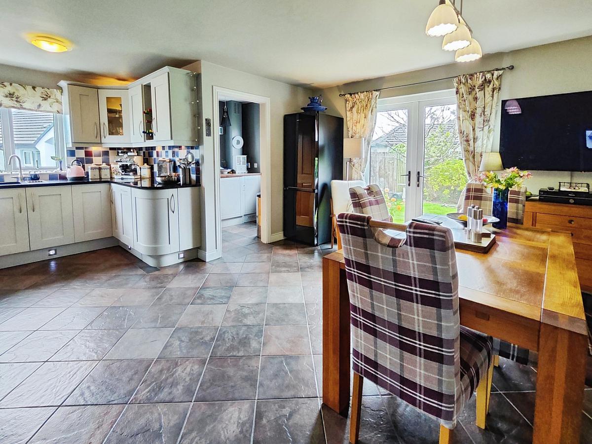 With fully fitted extensive range of eye and low level units with one and a half bowl sink unit and quartz worktops, integrated hob with extractor fan, integrated oven, integrated microwave, integrated dishwasher, space for fridge freezer, glass display cabinets, wine rack, kickboard lighting, tiled flooring and French doors to rear.