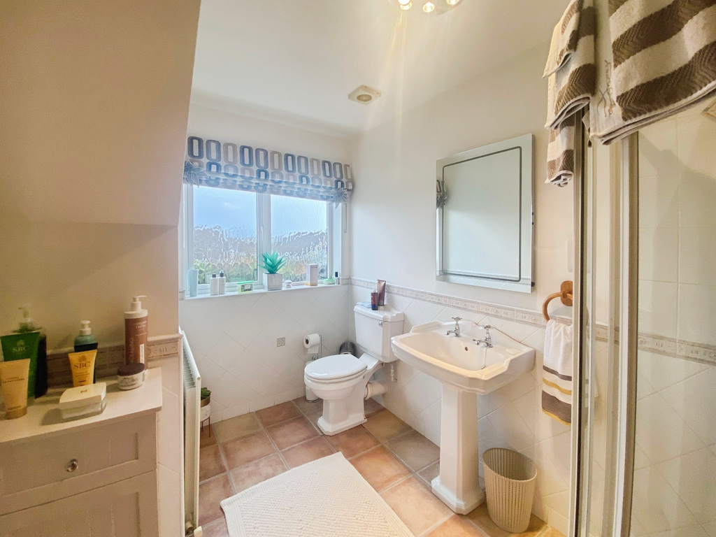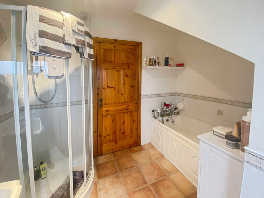 Suite comprising bath with telephone hand shower attachment, fully tiled walk in shower cubicle, wash hand basin, wc, half tiled walls, extractor fan and tiled floor.