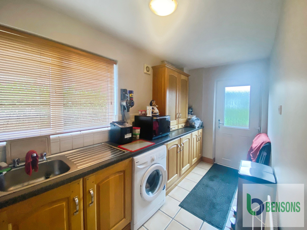 With stainless steel sink unit, eye and low level units, plumbed for washing machine, space for tumble dryer, extractor fan and tiled floor.