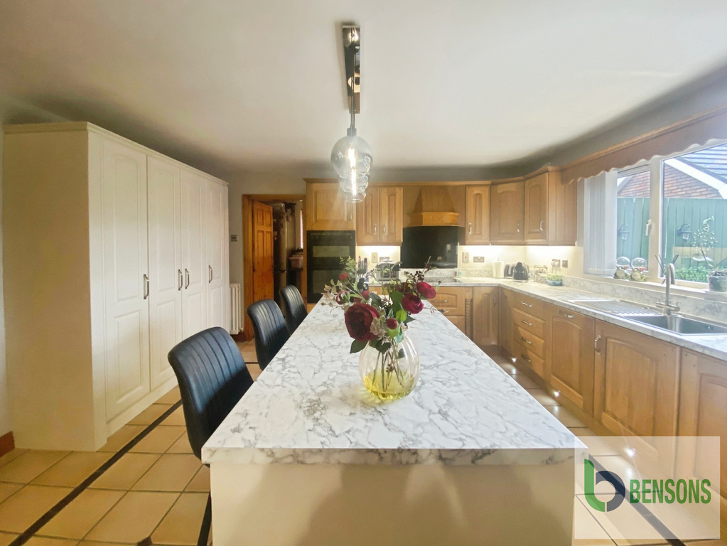 With fully fitted extensive range of eye and low level units with worktop with upstands and stainless steel sink unit, integrated hob with extractor fan and glass splash back, integrated eye level oven, integrated dishwasher, feature centre island/breakfast bar with low level storage, tiled floor and French doors to sun room.