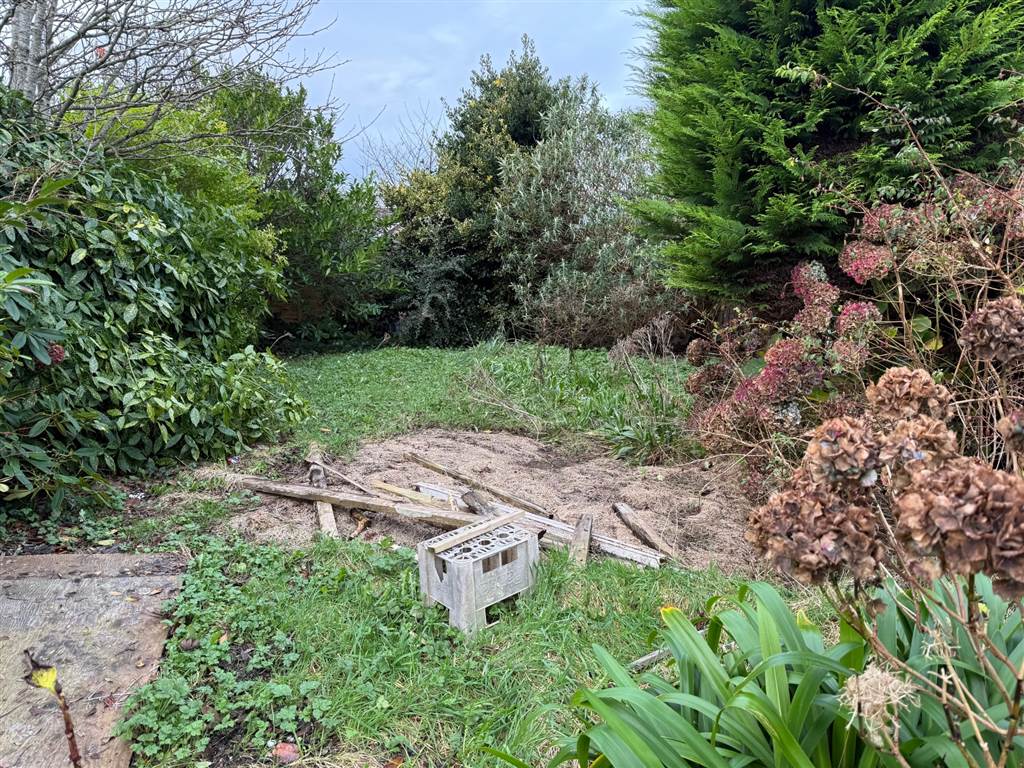 Concrete driveway leading to car port area with garage to rear (not measured). Front and rear garden in lawn.
