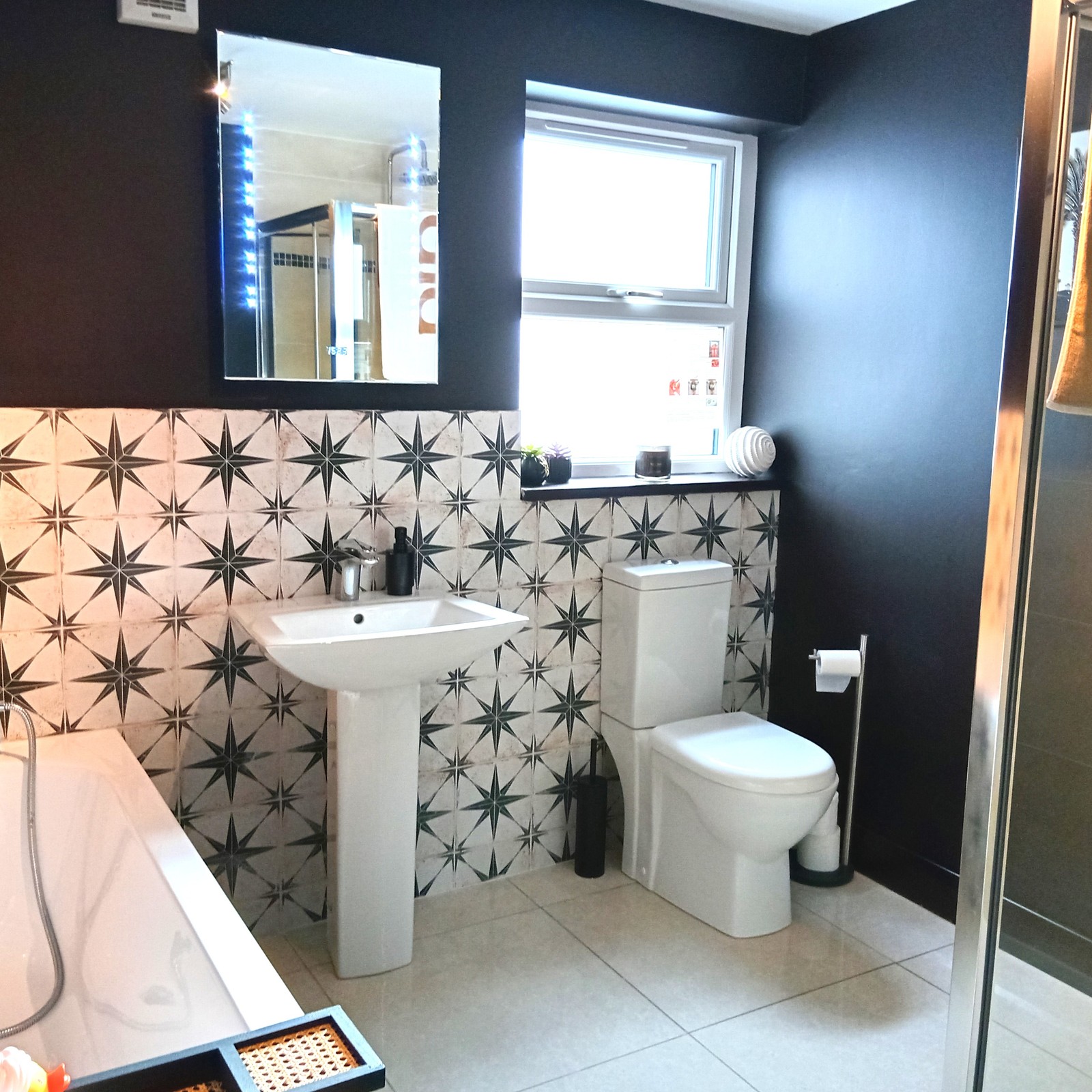 with WC, wash hand basin, bath and fully enclosed walk in shower cubicle.