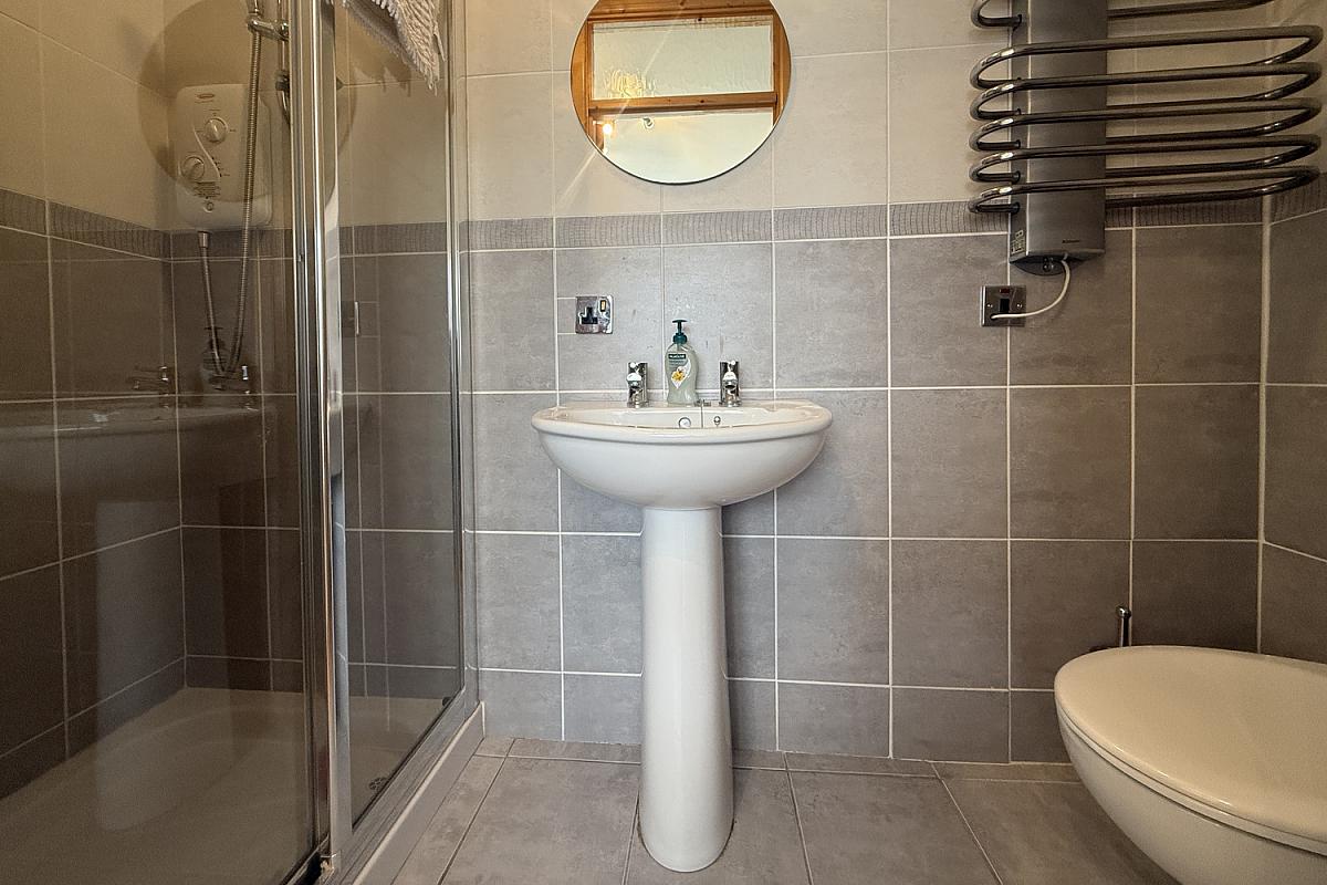 Electric shower in tiled cubicle; toilet; wash hand basin; electric towel radiator; tiled walls; tiled floor.
