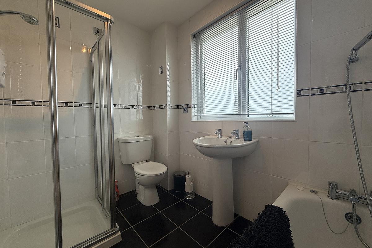 Panel bath with shower attachment; electric shower in tiled cubicle; toilet; wash hand basin; electric towel radiator; tiled walls; tiled floor.