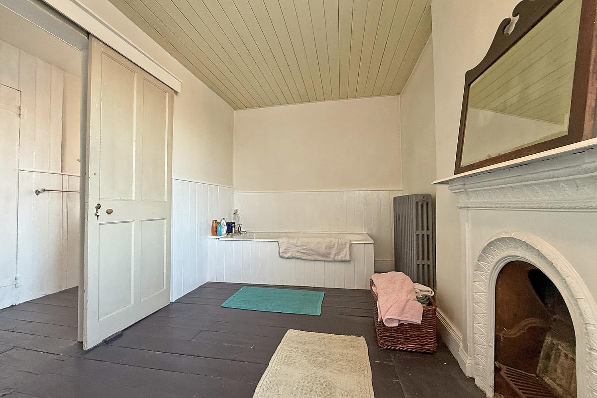Panel bath; wash hand basin; decorative cast iron fireplace; shelved hot press; wood floor.