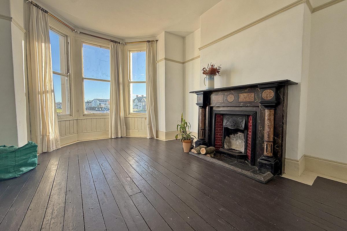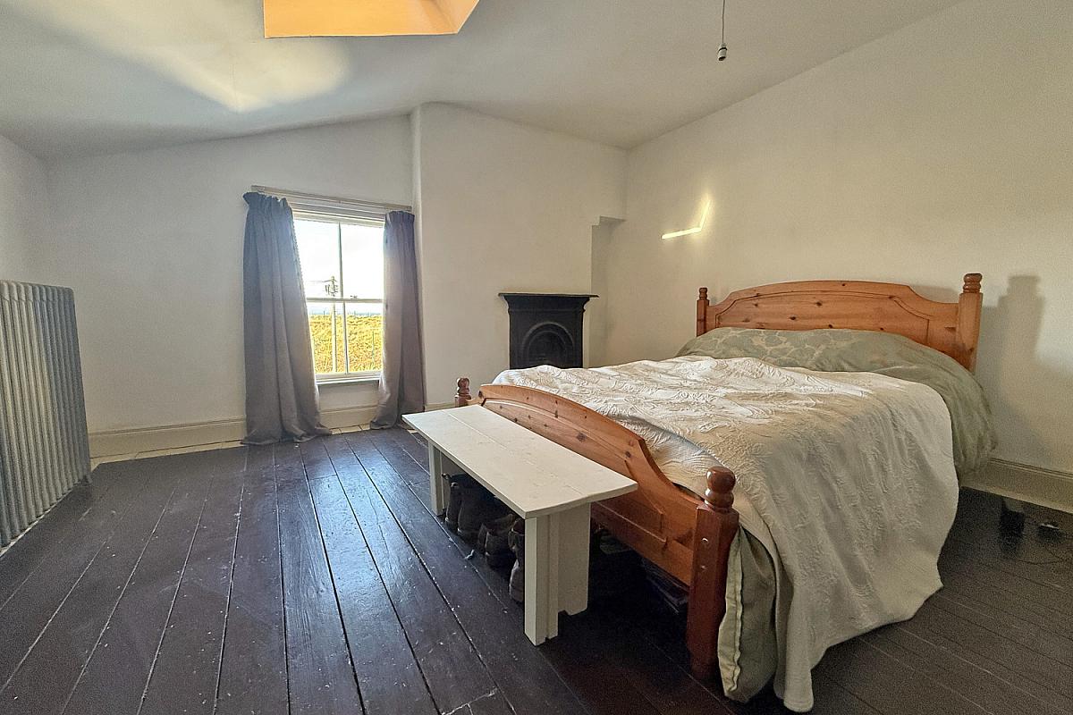 Double bedroom to the rear with distant sea views; decorative cast iron fireplace; wood floor.