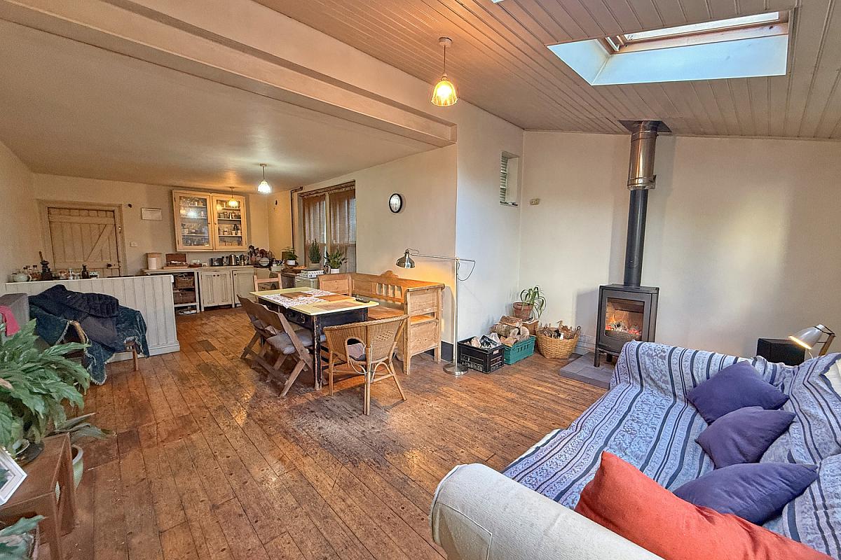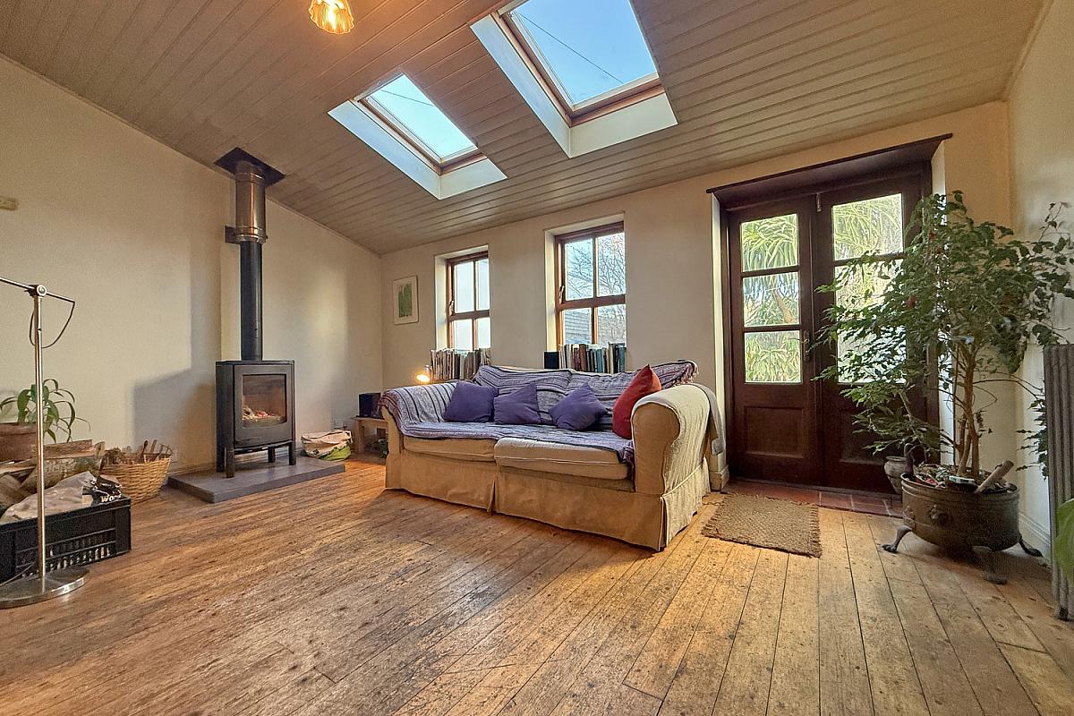 Wood burning stove set on a tiled hearth; skylights; wood floor; door to the rear.