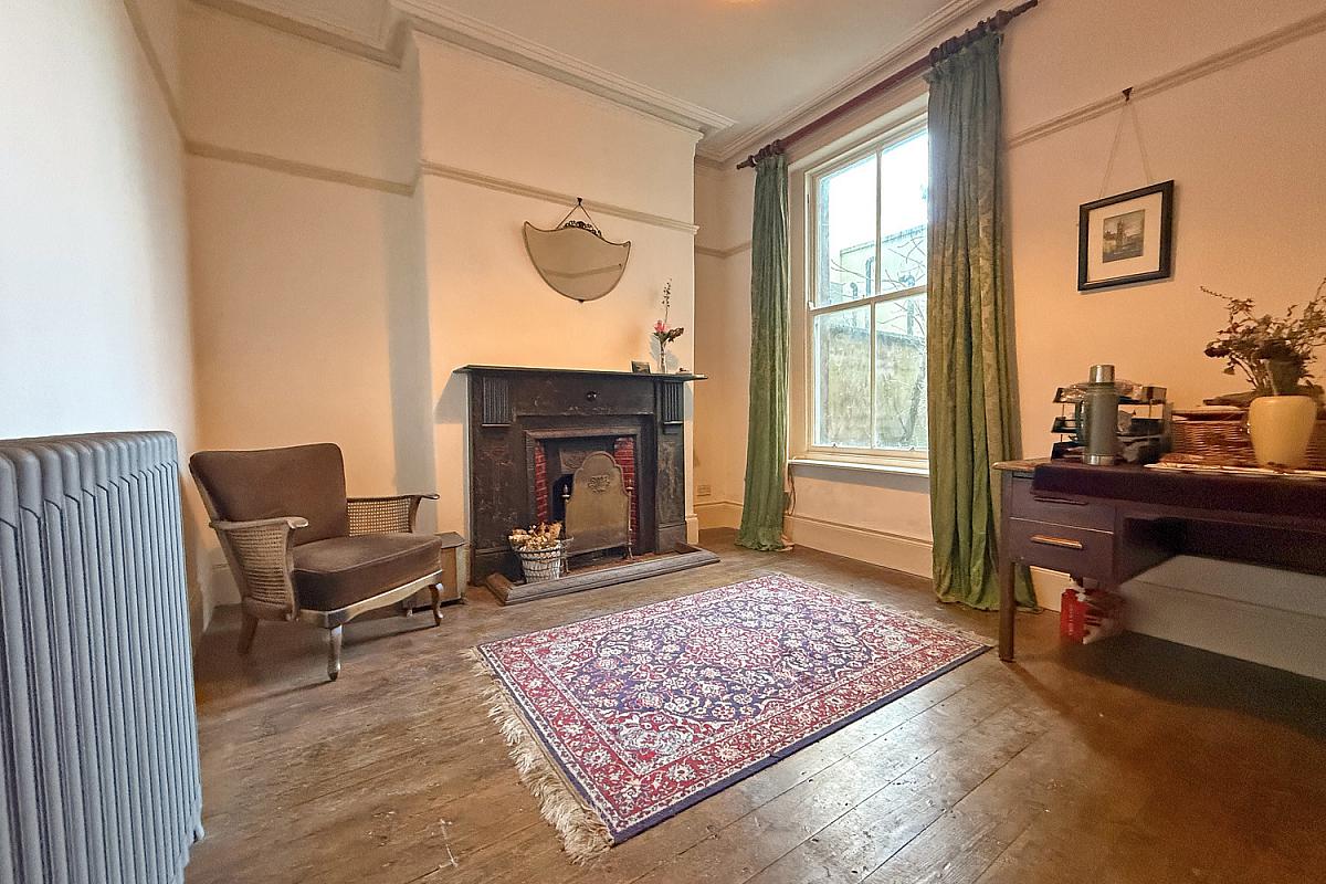 Bay window to the front; cast iron fireplace with a marble surround; wood floor.